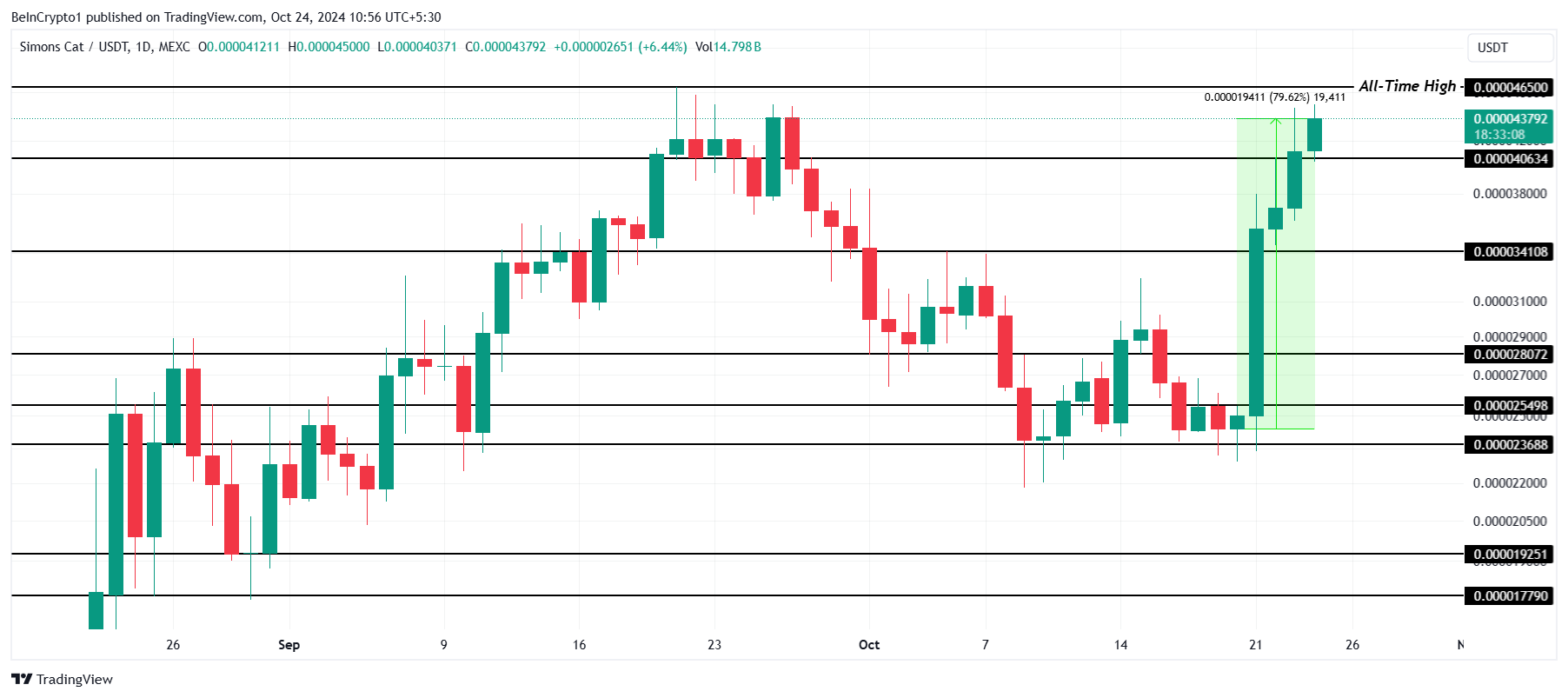 Atualmente, a CAT está próximo de seu recorde histórico (ATH) de US$ 0,00004650, alcançado há cerca de um mês. Dado o ímpeto ascendente contínuo, a altcoin está bem posicionada para ultrapassar esse nível e potencialmente estabelecer um novo ATH, reforçando ainda mais a perspectiva otimista para a criptomoeda.