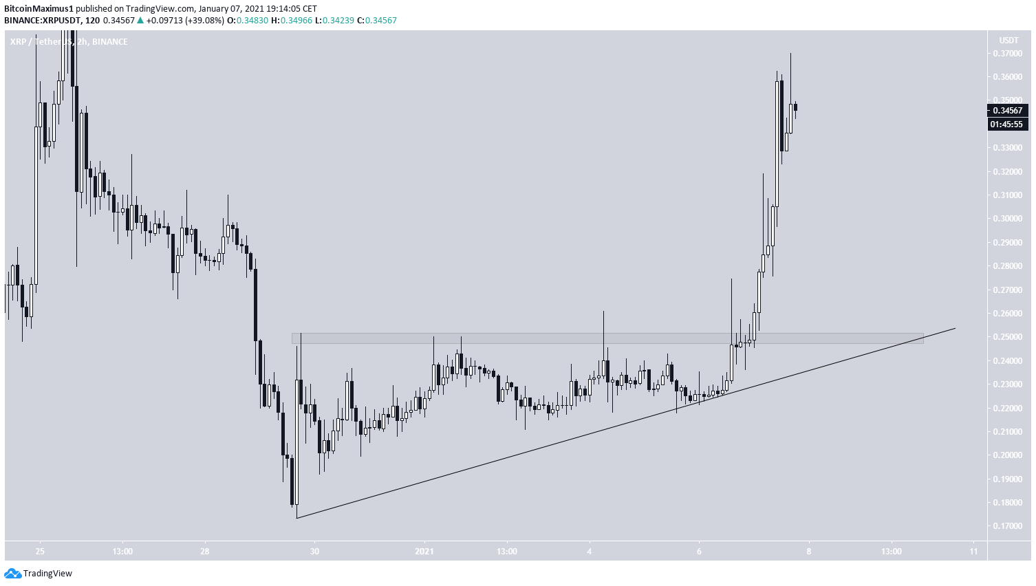 O gráfico de duas horas mostra que o movimento de curto prazo se tornou parabólico. Além disso, a XRP está seguindo uma linha de suporte ascendente, que coincide com a área de suporte menor de $ 0,25.