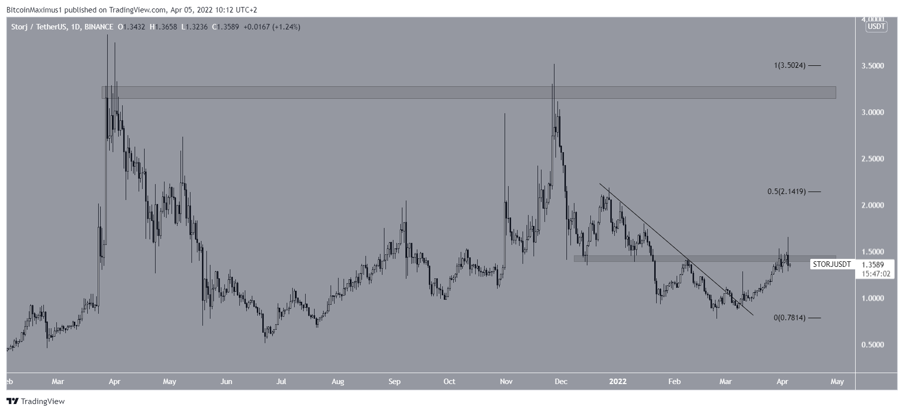 O preço do token vem subindo desde então, conseguiu romper uma linha de tendência de baixa em 9 de março. Atualmente, ele está dentro da área de resistência de US$ 1,40. Um rompimento acima provavelmente levaria o STORJ à retração de 0,5 de Fibonacci em US$ 2,15.
