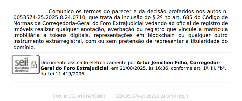 Agora à noite a ABToken se manifestou contra a Circular n. 410, de 18 de agosto de 2025. O documento estabelece proibição expressa de vincular matrículas imobiliárias a tokens digitais, representações em blockchain ou outros instrumentos.