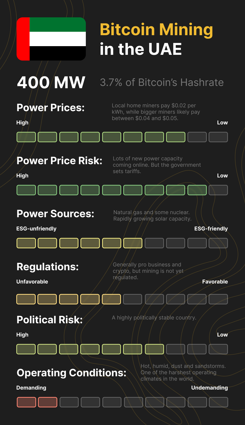 Apesar dessa regulamentação, os Emirados Árabes Unidos (EAU) continuam a favor das criptomoedas. Em 2023, o país emergiu como um participante significativo no cenário global de mineração de Bitcoin, com uma capacidade combinada de mineração de Bitcoin de cerca de 400 megawatts, contribuindo com aproximadamente 4% da taxa global de hash de Bitcoin.