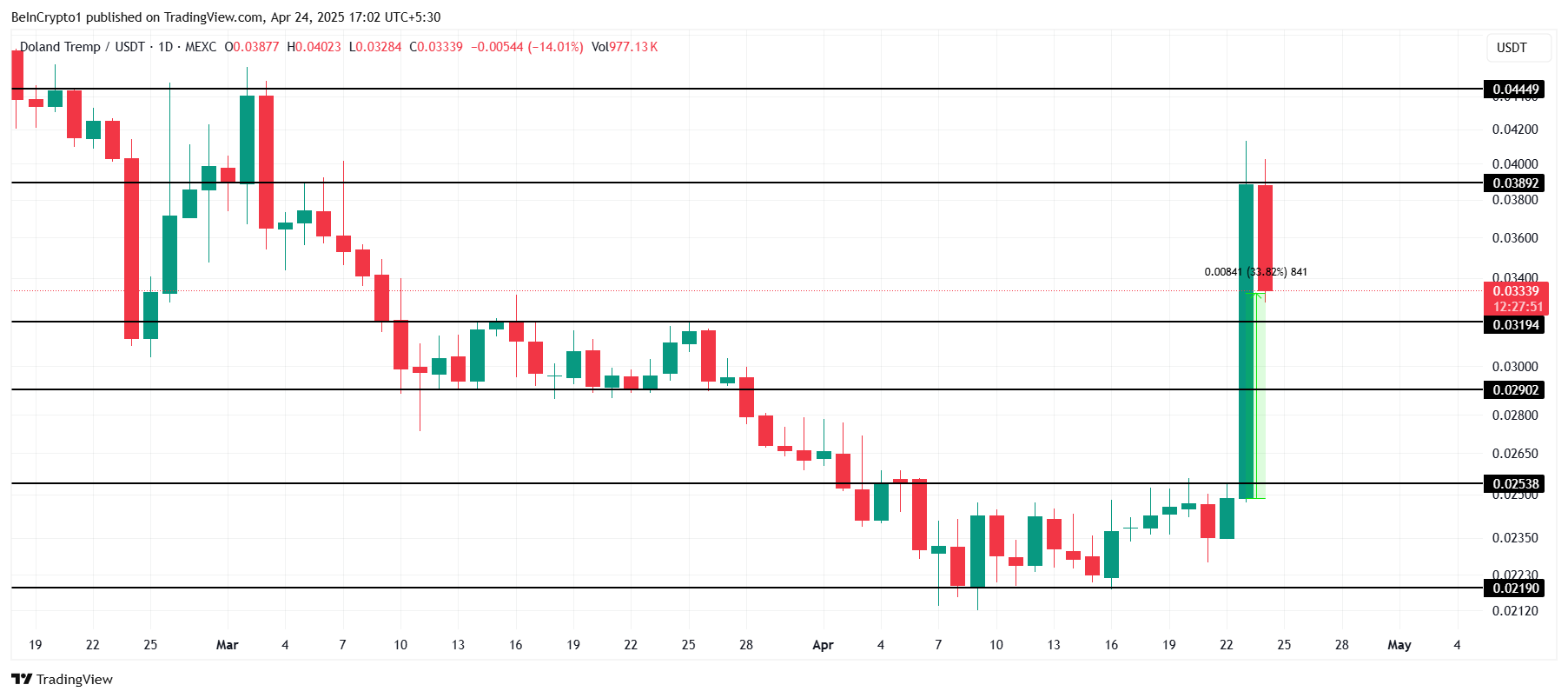 Se a TREMP conseguir manter seu suporte atual em US$ 0,0319, a altcoin pode se recuperar. Com o apoio certo dos investidores, pode avançar para US$ 0,0389 nos próximos dias, promovendo sua recuperação. Isso seria essencial para manter o sentimento otimista e garantir uma ascensão mais sustentada no futuro.