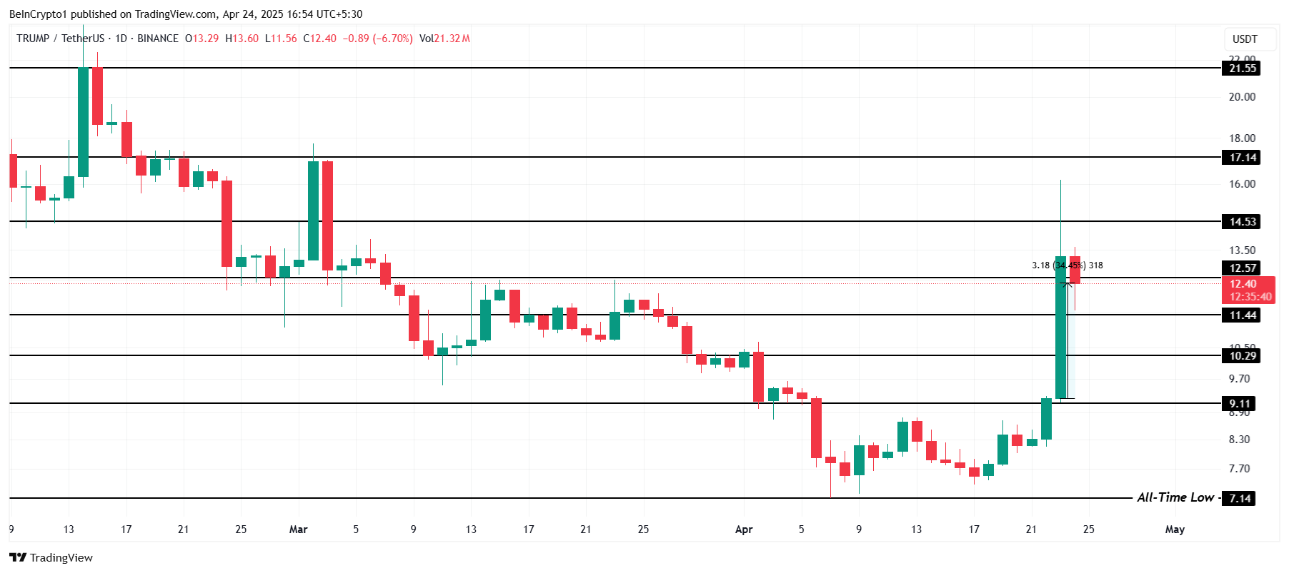Atualmente cotada a US$ 12,40, a TRUMP se aproxima da resistência de US$ 12,57. Caso o impulso positivo continue, essa resistência pode se transformar em um novo suporte, permitindo que o token siga sua trajetória de alta. Um rompimento sólido de US$ 12,57 abriria caminho para o próximo nível de resistência em US$ 14,53, aumentando o interesse de novos investidores.