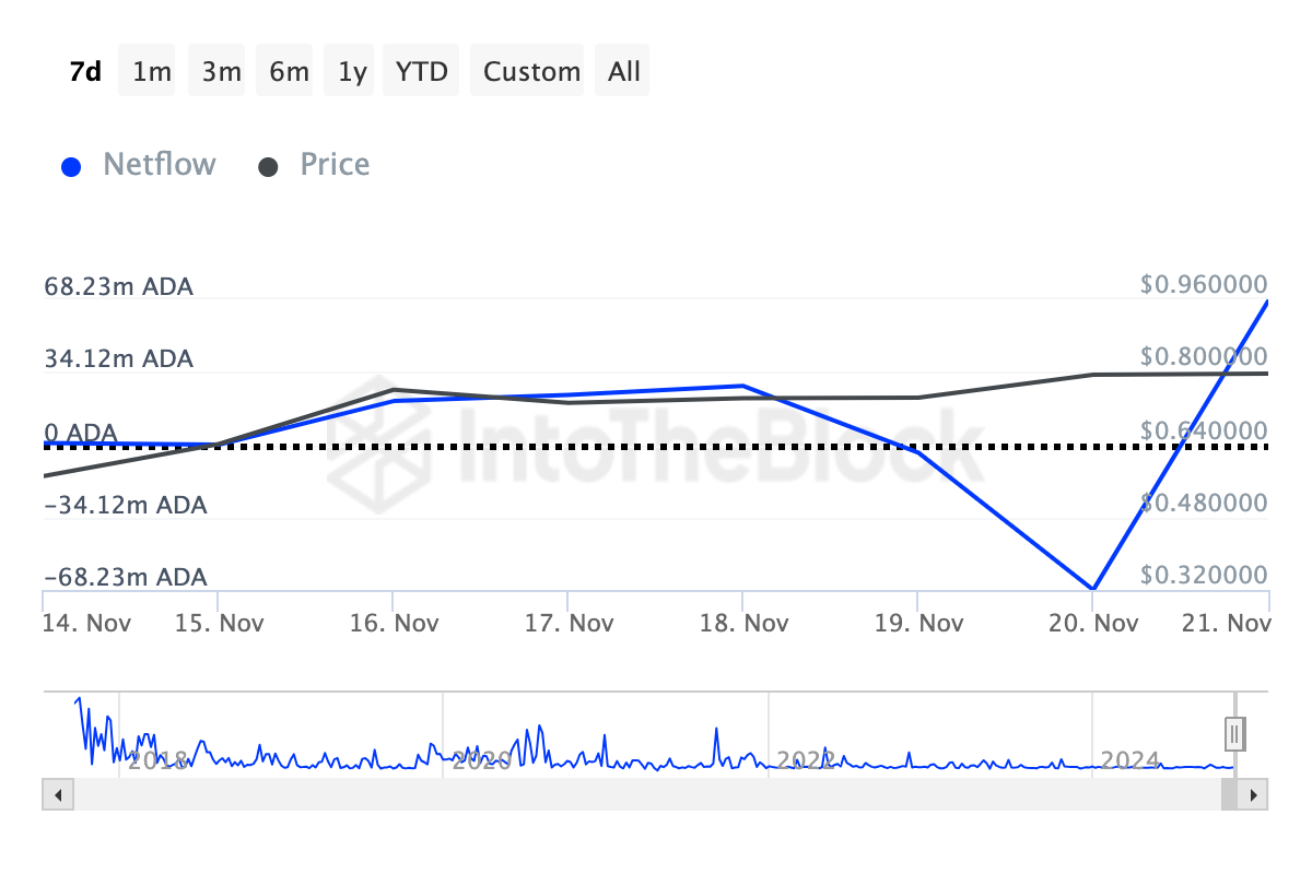 De acordo com o IntoTheBlock, o fluxo líquido dos grandes detentores de ADA aumentou para 67,51 milhões de ADA, sinalizando uma significativa mudança de sentimento entre as baleias. O fluxo líquido representa a diferença entre a quantidade de ADA comprada e vendida por grandes detentores em um período específico.