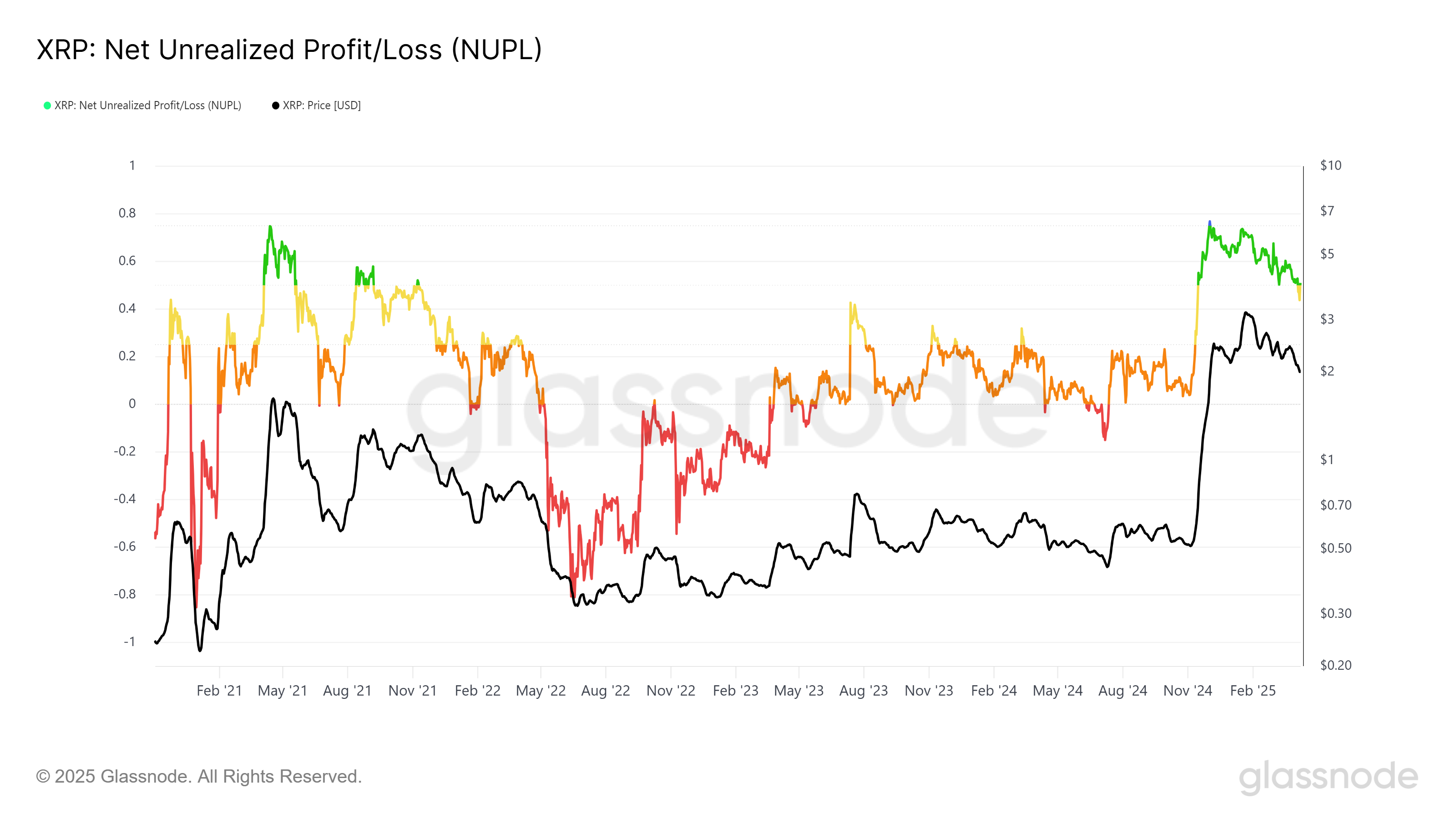 Olhando para o sentimento mais amplo do mercado, o XRP enfrenta desafios com seu NUPL (Lucro/Perda Não Realizado Líquido), que recentemente caiu abaixo da marca de 0,5 pela primeira vez em cinco meses. Essa queda indica que o XRP entrou na “zona de ansiedade”, uma área historicamente associada a correções de mercado.