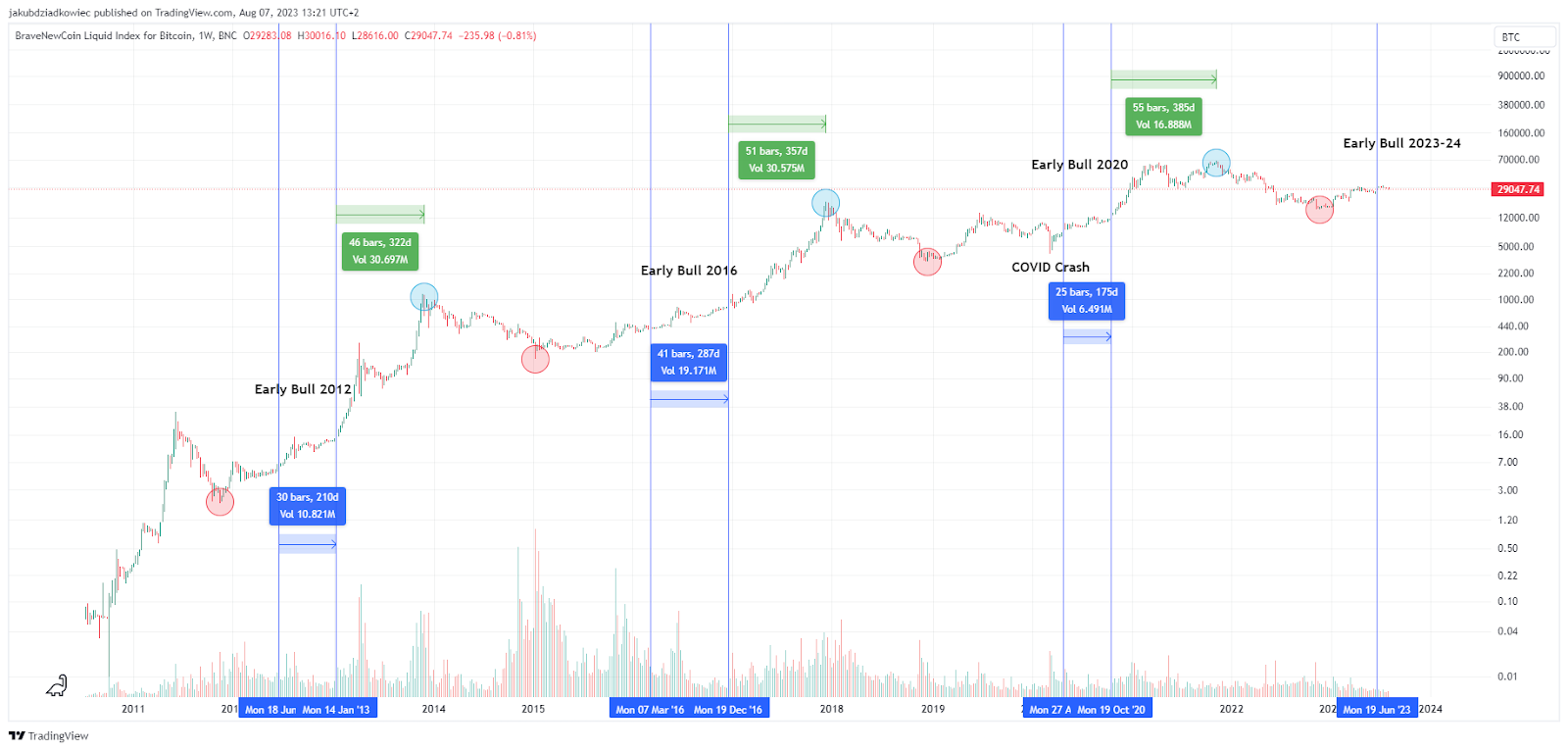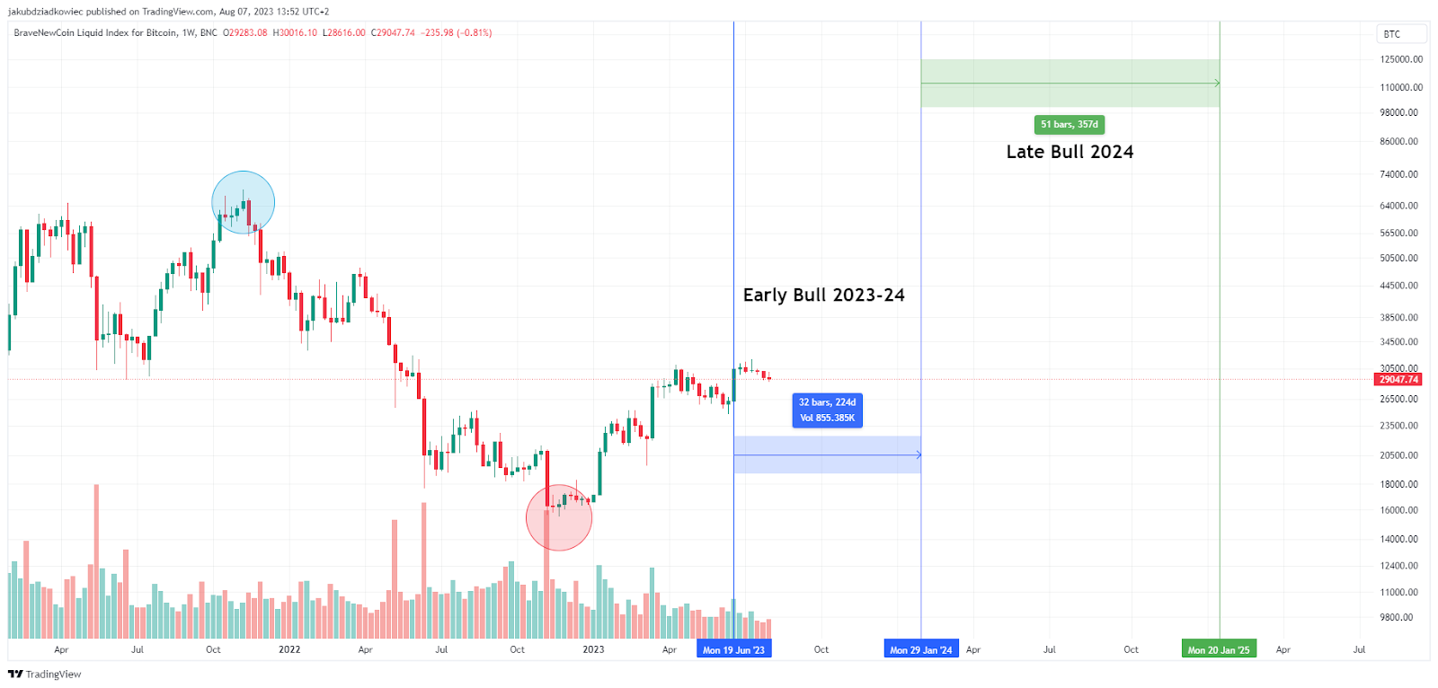 No entanto, se isso não acontecer, pode-se supor que o acúmulo de Bitcoin já dura cerca de 7 semanas. Subtraindo este valor ao tempo médio de acumulação (32 semanas), obtemos um período de cerca de 6 meses. Portanto, o mercado de alta inicial deve durar até o final de janeiro de 2024.