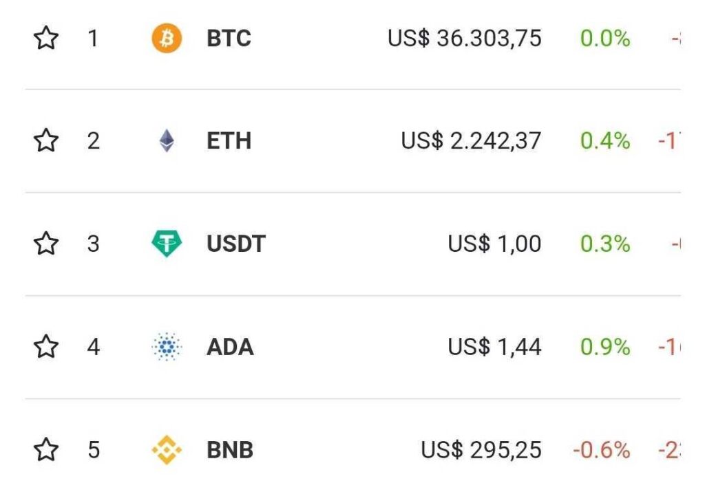 No fechamento, a ADA era negociada a US$ 1,44, BNB a US$ 295 e a ETH a US$ 2.242.