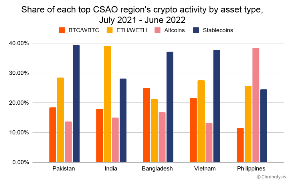 Como mostra o gráfico acima, stablecoins e ETH/WETH são os dois principais tipos de ativos mais negociados em muitos países da CSAO – consistente com um modelo de adoção centrado em remessa e NFT.