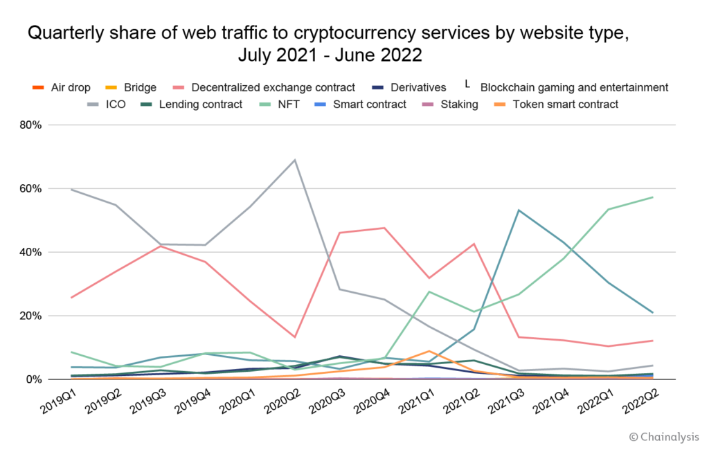 O tráfego para sites relacionados a assuntos como contratos de câmbio descentralizados, no entanto, diminuiu nos últimos trimestres. Isso provavelmente está conectado ao mercado o inverno cripto de acordo com o estudo.