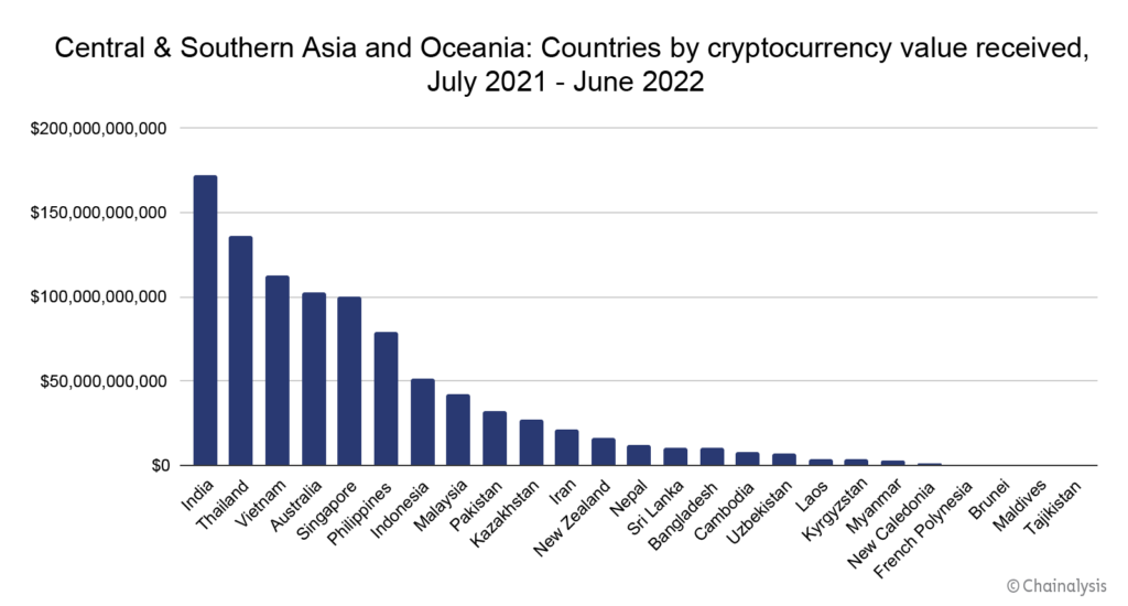 A Índia lidera a atividade com criptomoedas e movimentou US$ 172 bilhões em valor de criptoativos de julho de 2021 a junho deste ano. Tailândia, Vietnã, Austrália e Cingapura seguem logo atrás, cada um recebendo mais de US$ 100 bilhões em criptoativos.