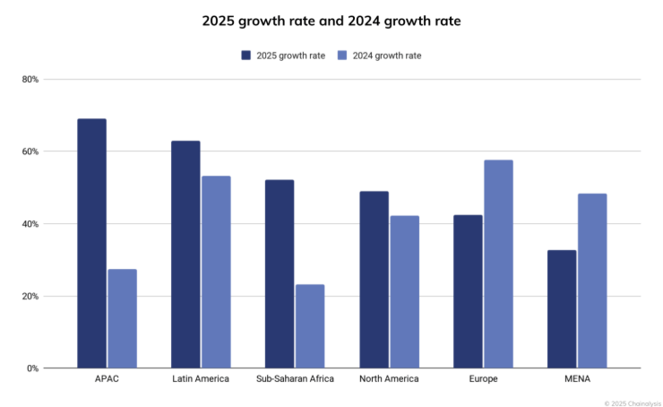 Sponsored“Comparado ao ano anterior, este ciclo registrou crescimento acelerado em quase todas as regiões, com aumentos especialmente expressivos na APAC e na América Latina. No ano passado, a APAC cresceu apenas 27%, mas no período mais recente, esse número mais que dobrou, atingindo 69%. Da mesma forma, a América Latina passou de 53% para 63% ano a ano, consolidando a trajetória da região como um dos centros de crescimento mais rápido no campo das criptomoedas”, afirma o relatório da Chainalysis.