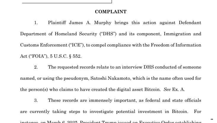 James Murphy, conhecido nas redes sociais como “MetaLawMan“, entrou com um processo contra o Departamento de Segurança Interna dos Estados Unidos (DHS) com o objetivo de descobrir a verdadeira identidade de Satoshi Nakamoto, o criador do Bitcoin.