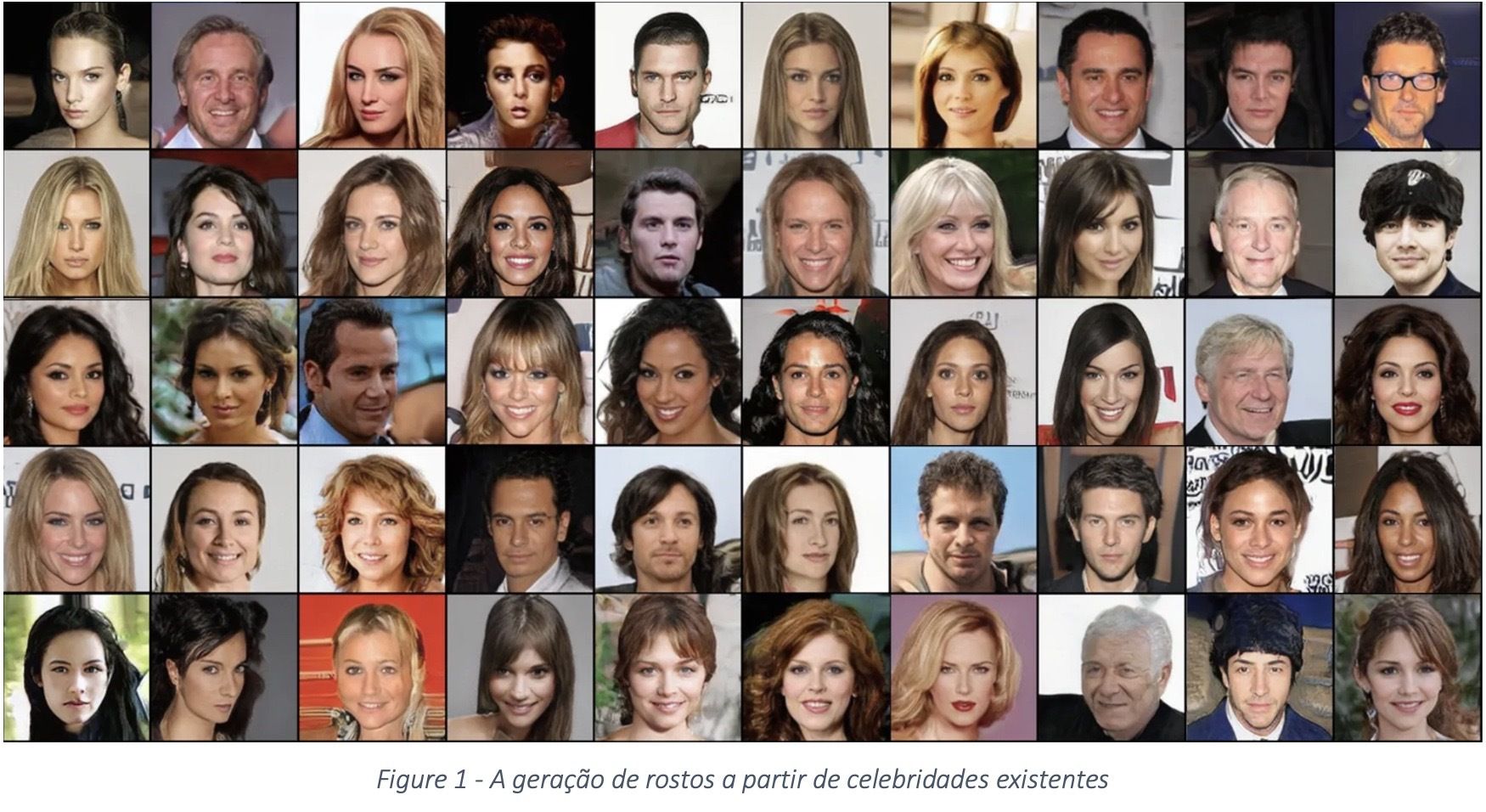 Como exemplo, na figura 1, veja a imagem gerada por Ian Goodfellow em 2014, que a partir de um modelo real (fotos de celebridades reais) gerou novas amostras de fotografia que imitam um conjunto de dados já existentes.