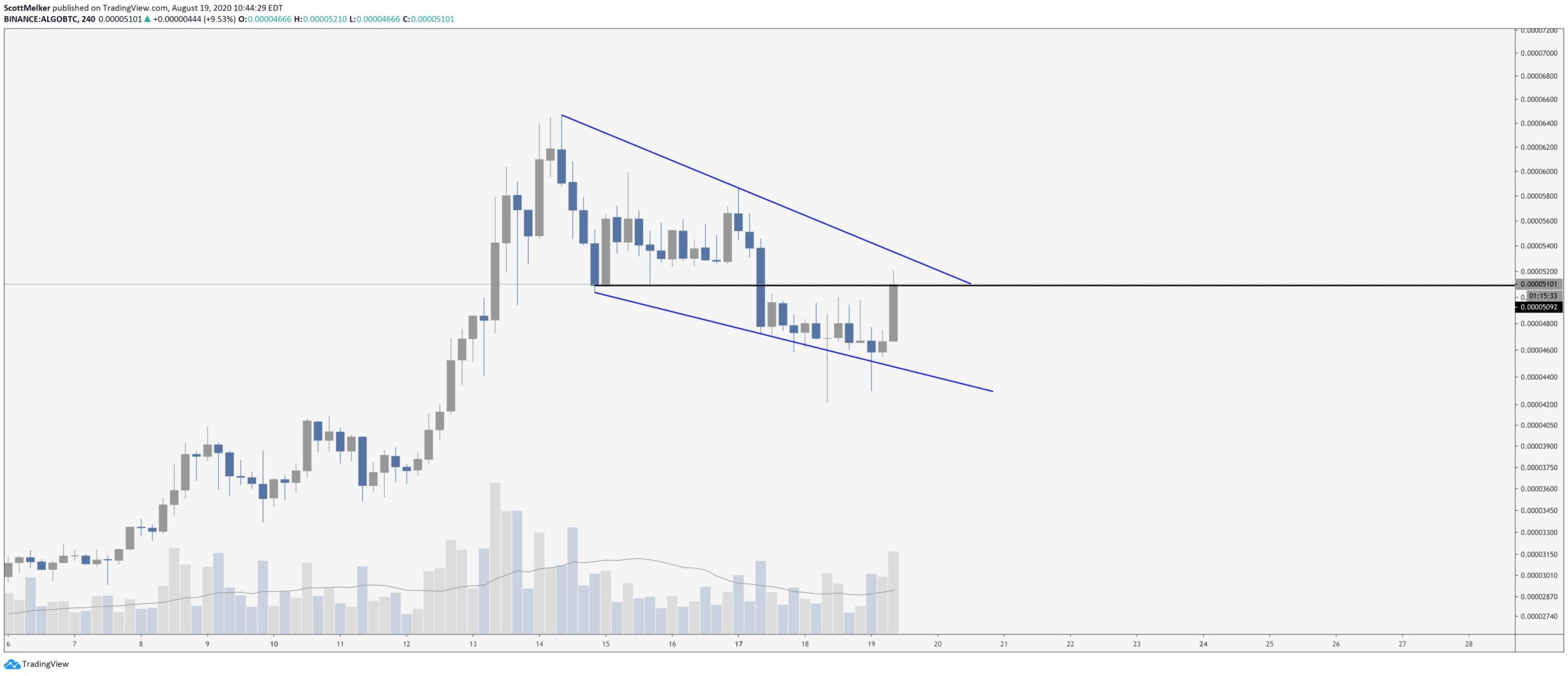O preço da ALGO vem subindo de forma acelerada desde o início de agosto. No dia 12 de agosto, o preço rompeu acima da área de $ 0,5, que fornecia resistência desde março, e atingiu uma alta de $ 0,749. A queda que se seguiu fez com que o preço validasse o nível de rompimento como suporte.
