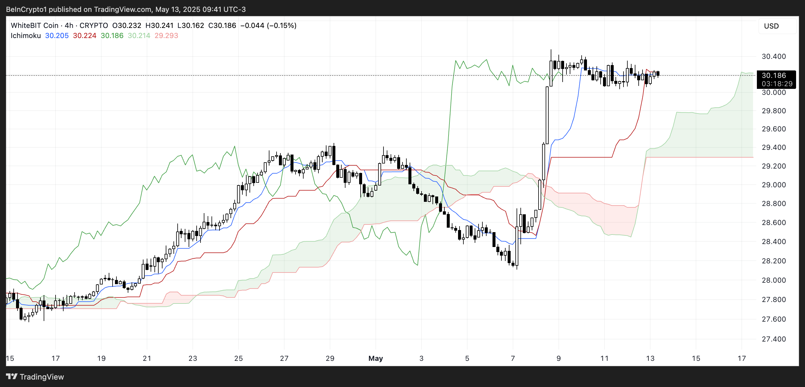A Nuvem Ichimoku para a WhiteBIT mostra uma estrutura neutra a otimista. A ação de preço está atualmente acima da nuvem, o que é geralmente um sinal de alta.