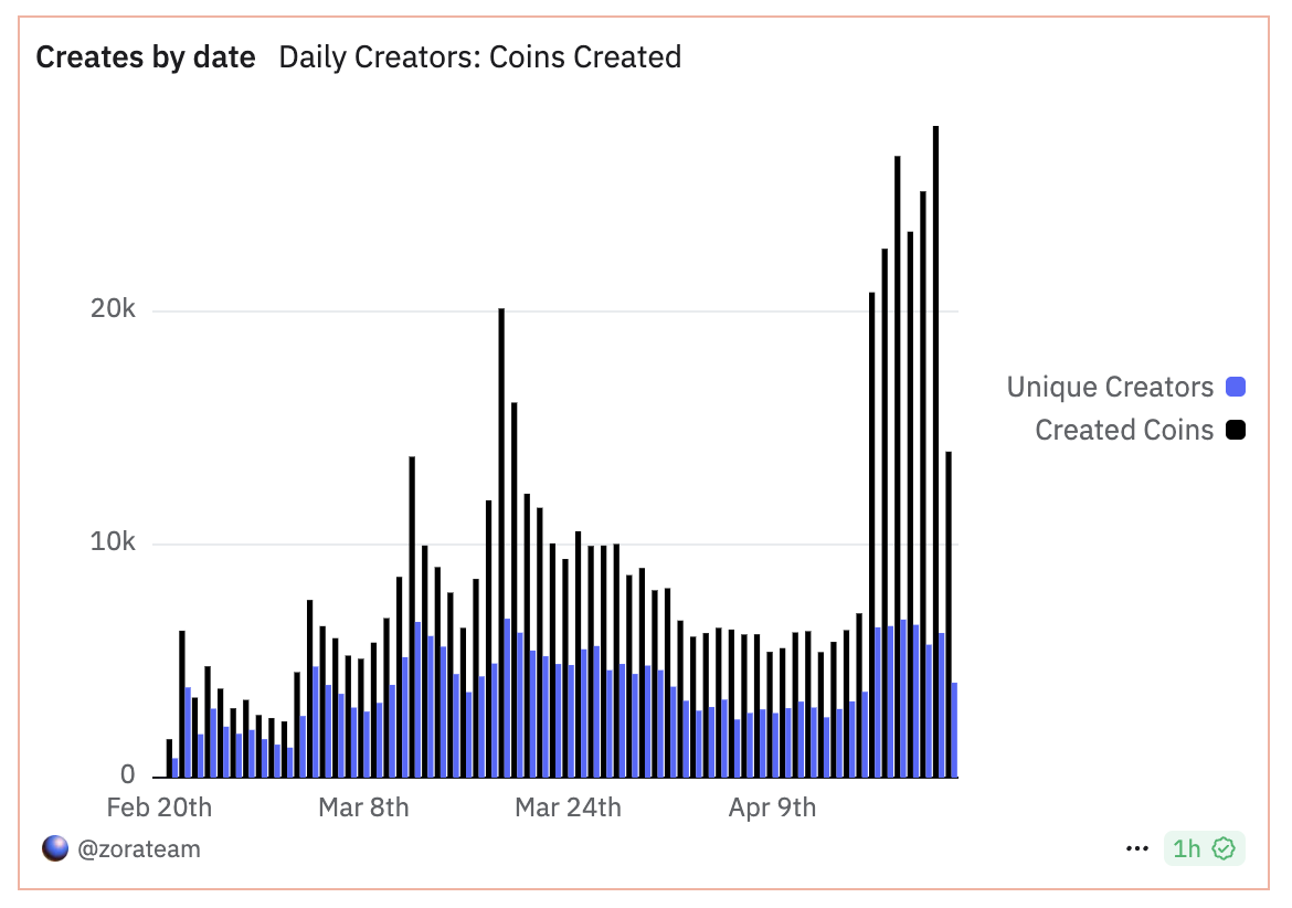 Desde que a Base chain começou a promover a ideia de Content Coins, a atividade na Zora aumentou visivelmente. O número de moedas recém-criadas permaneceu acima de 20 mil desde 17 de abril, atingindo quase 28 mil ontem (22).