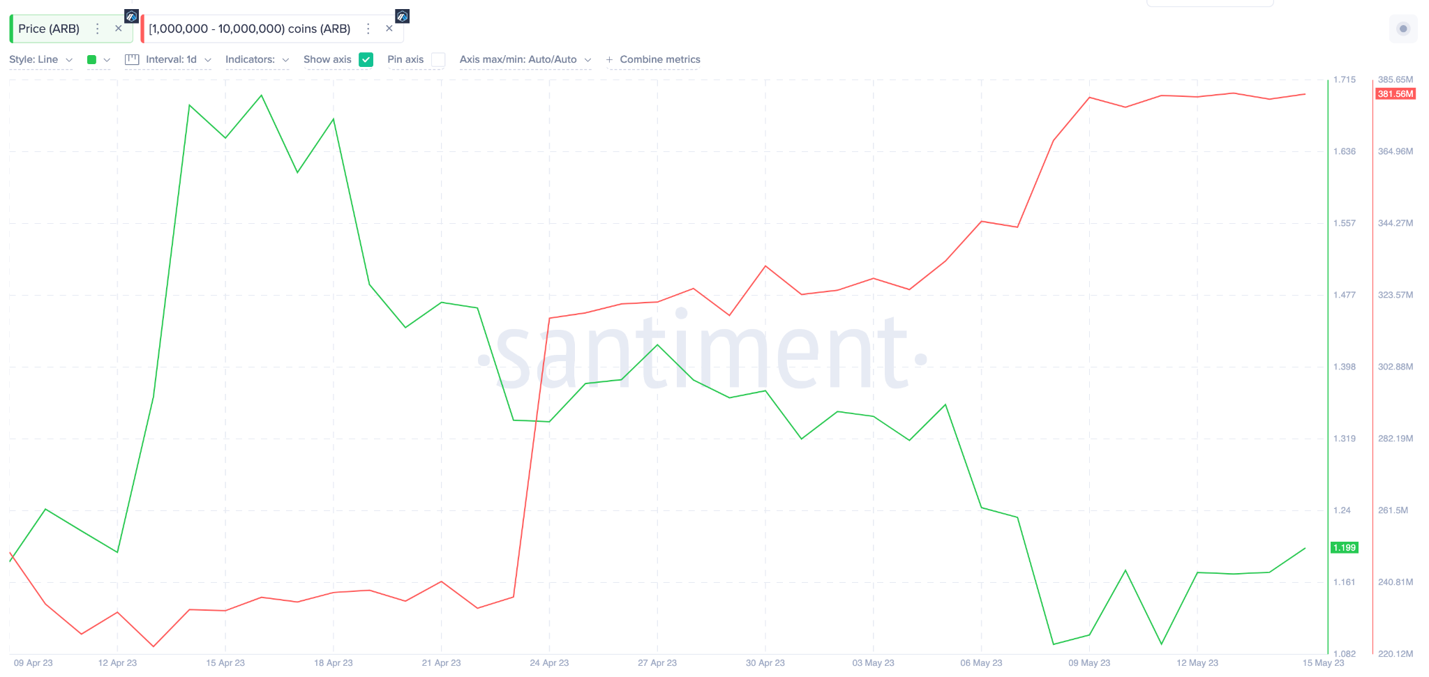 O gráfico abaixo mostra como eles adicionaram outros 158 milhões da altcoin ARB às suas carteiras entre 13 de abril e 16 de maio.