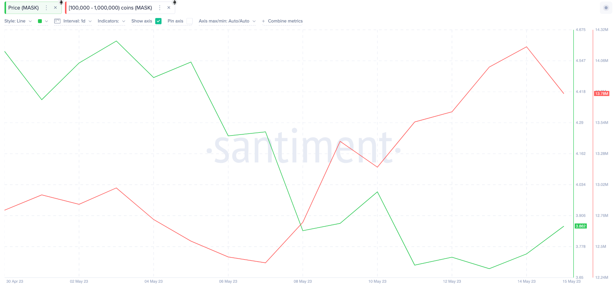 O gráfico abaixo mostra como as baleias criptográficas com 100.000 a 1 milhão de MASK acumularam outros 1,41 milhão de tokens desde 7 de maio.