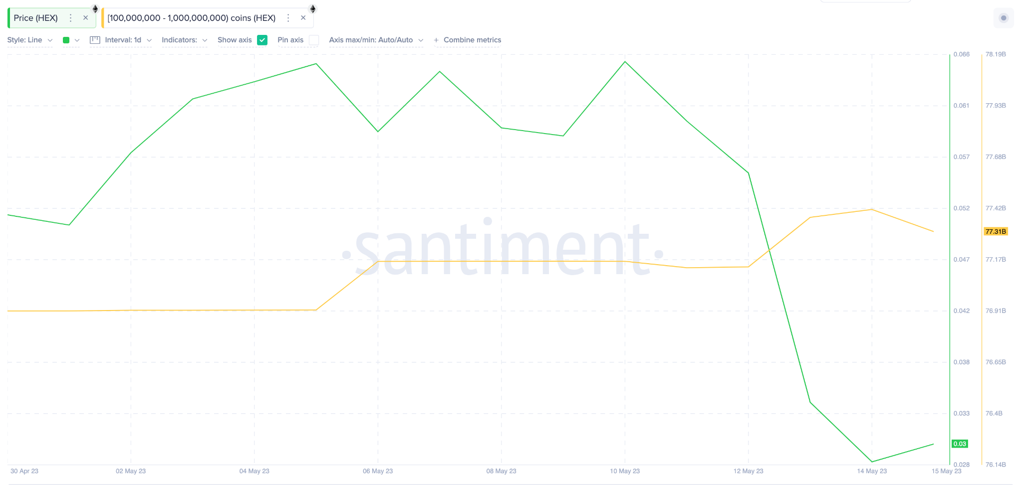 O gráfico Santiment abaixo mostra como eles adicionaram outros 400 milhões de tokens no valor de quase US$ 13 milhões aos seus saldos entre 5 e 16 de maio.