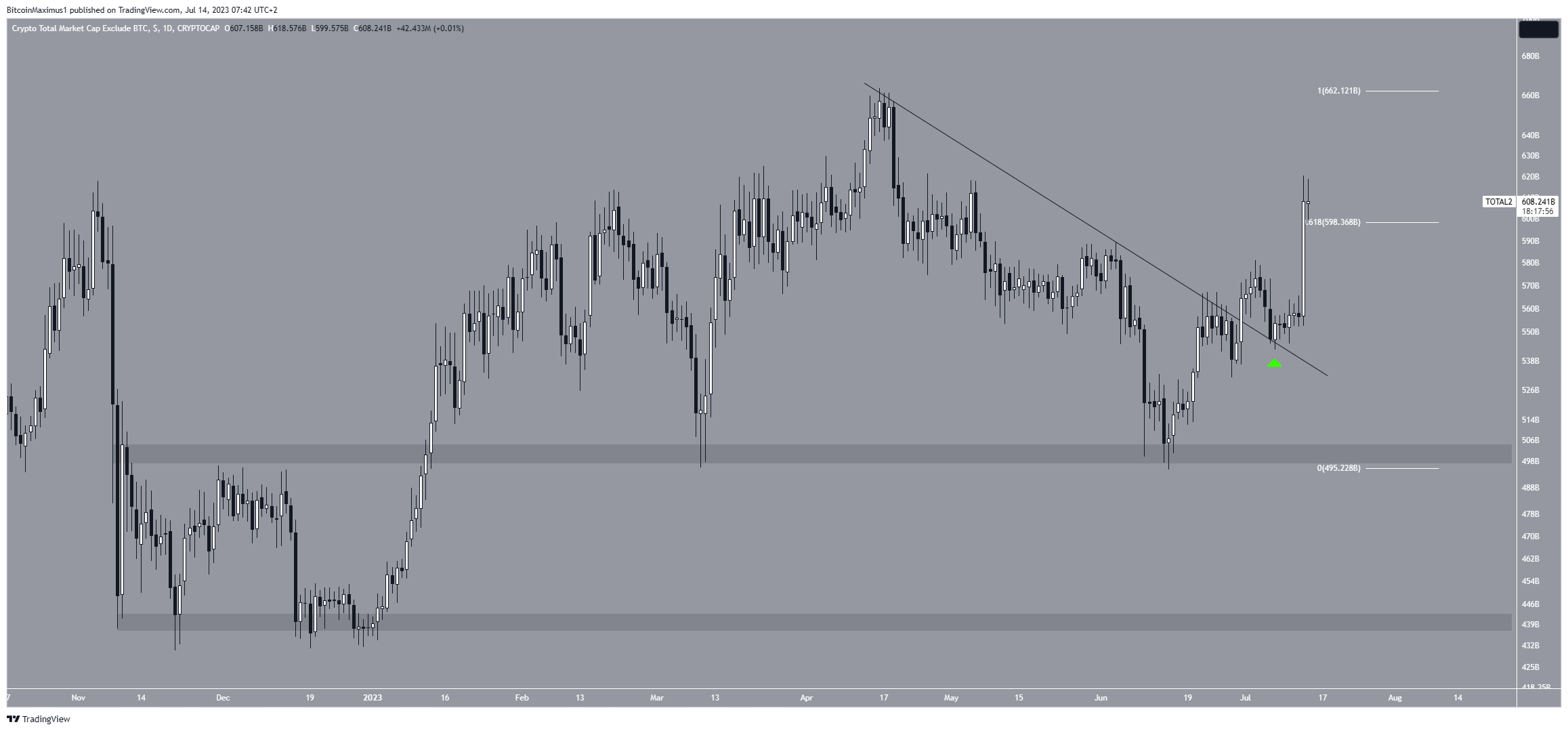 SponsoredDevido a isso, o valor total das altcoins pode subir para uma nova máxima anual de US$ 700 bilhões se a tendência atual continuar. No entanto, se o preço fechar abaixo do nível de 0,618, poderá ocorrer uma queda para o próximo suporte de US$ 540 bilhões.