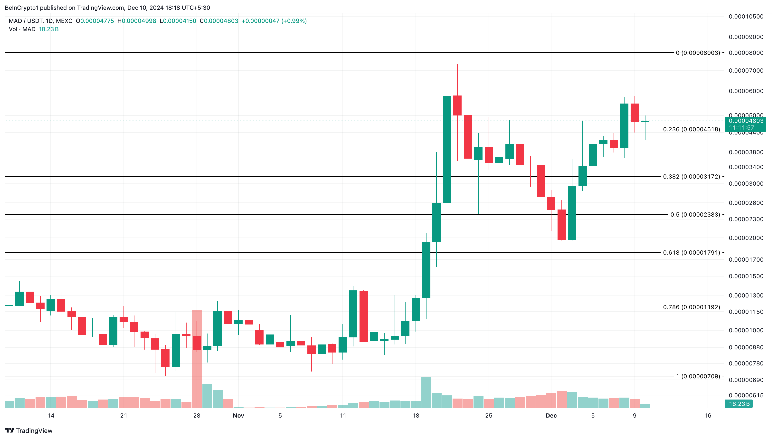No momento desta escrita, o valor de mercado da MAD é de US$ 0,000048, mas está em destaque porque o mercado mais amplo continua interessado nele. Do ponto de vista técnico, a altcoin tentou atingir um novo pico devido à formação de uma recuperação em forma de V.