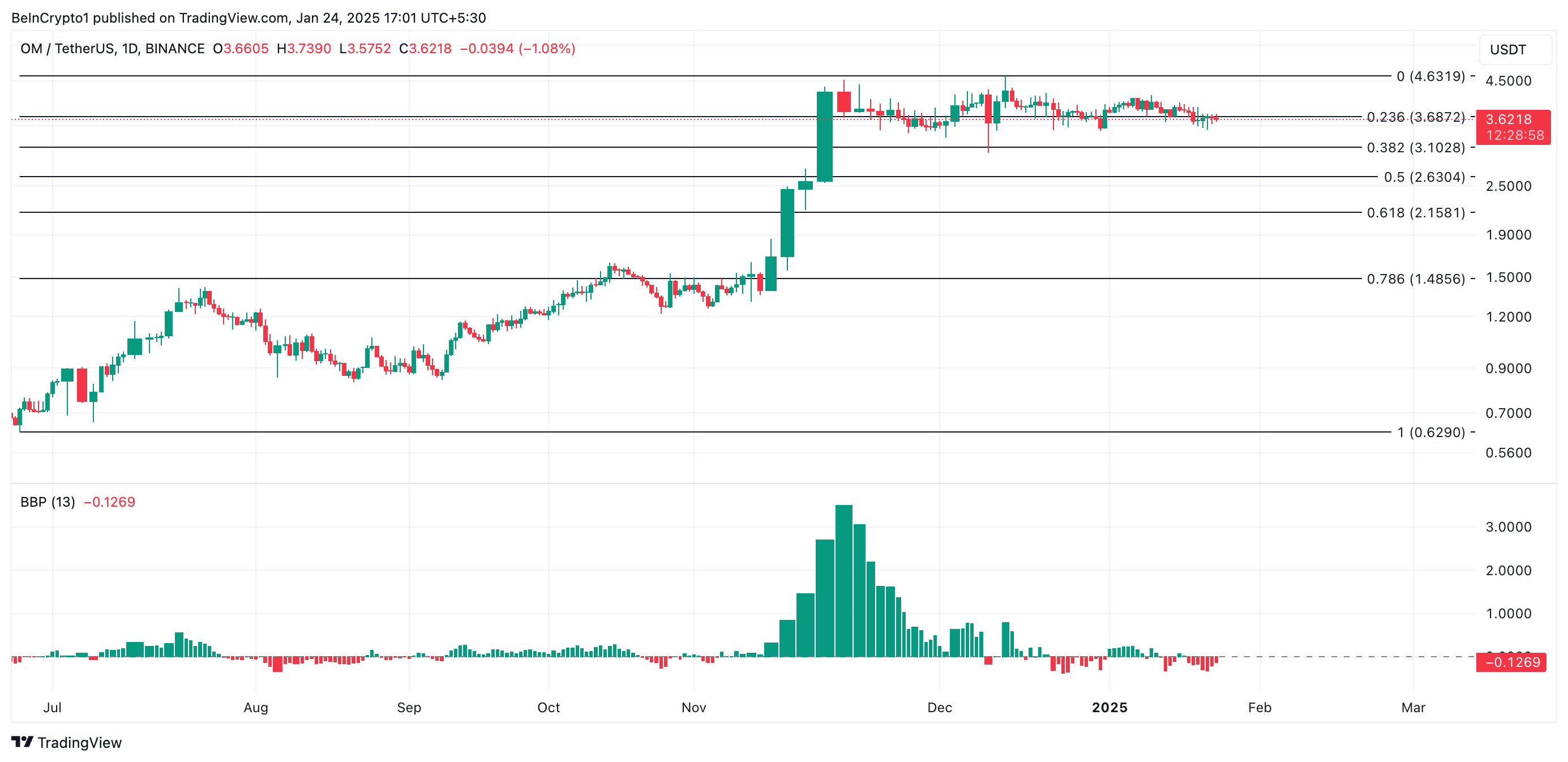 No entanto, esse leve aumento apenas reflete os ganhos mais amplos do mercado, já que a atividade de venda continua nos mercados à vista de OM. Leituras do seu Índice Elder-Ray, que está em -0,12 no momento da publicação, confirmam isso.
