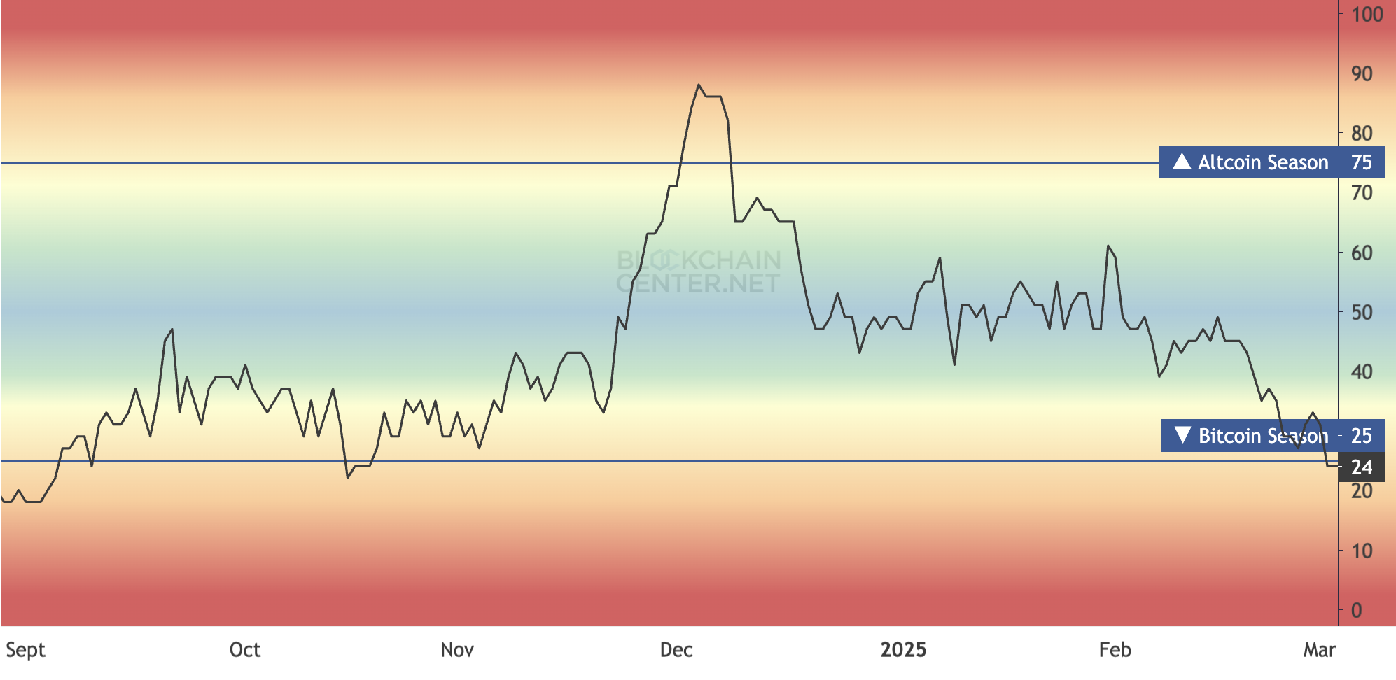 Este ciclo começa quando pelo menos 75% das 50 principais altcoins superam o BTC em um período de três meses. No entanto, isso está longe da realidade. O Índice de Altcoins, que acompanha essa tendência, caiu para seu nível mais baixo desde outubro de 2024, sinalizando fraqueza contínua no setor.