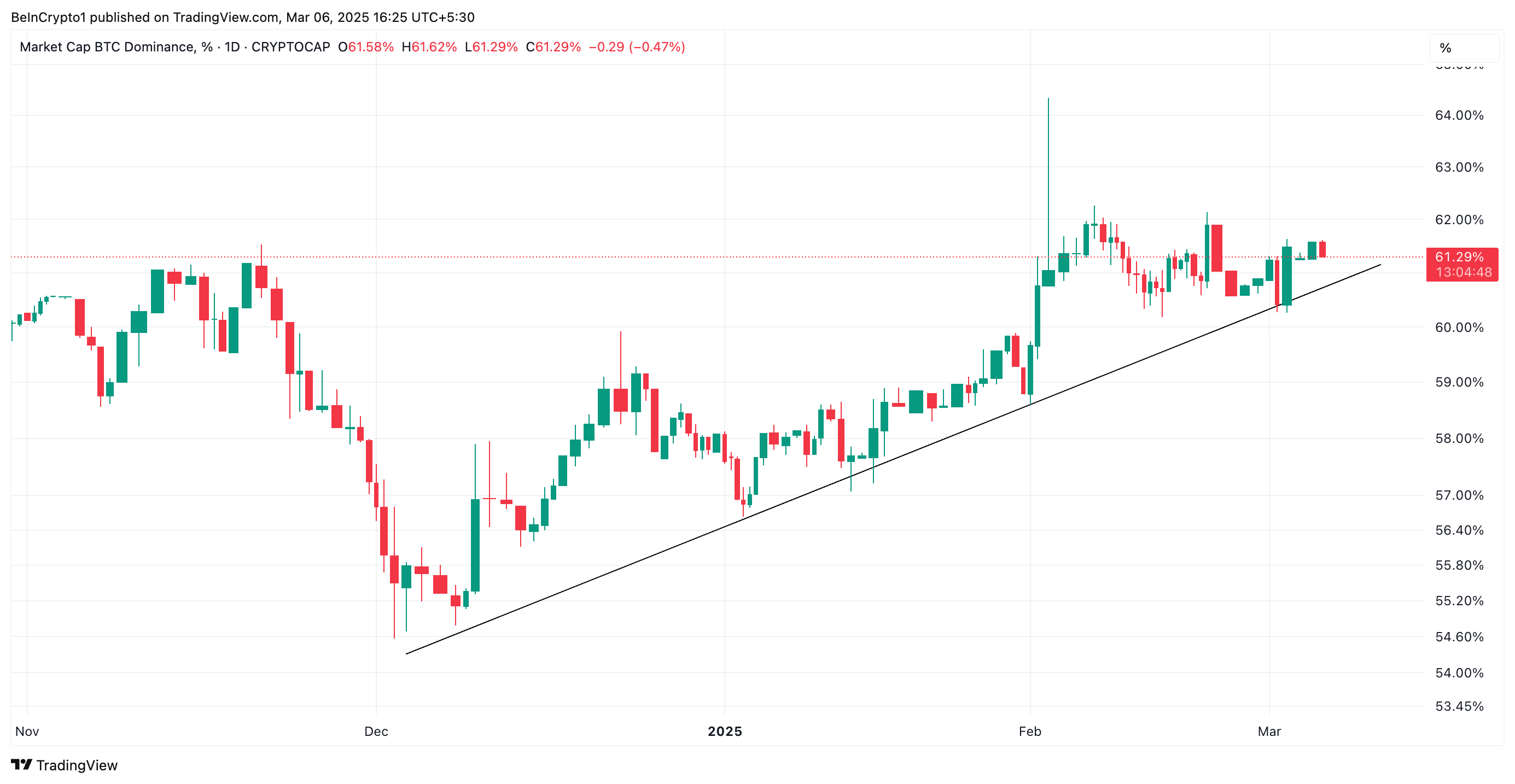 Esta métrica, que mede a porcentagem da capitalização total de mercado de criptomoedas que o Bitcoin detém, permaneceu acima de uma linha de tendência ascendente desde dezembro passado. Até o momento, está em 61,29%.