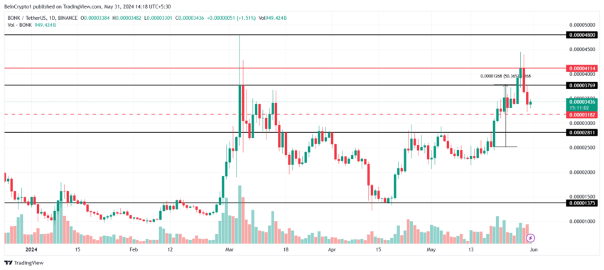 Com a euforia em torno das memecoins, a BONK entrou na lista das 50 principais criptomoedas em valor de mercado.