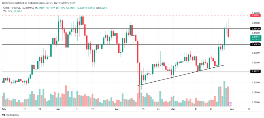 Isso, por sua vez, poderá beneficiar a CHZ à medida que o uso da rede e dos ativos aumentar. Como resultado, a altcoin poderia ultrapassar US$ 0,154 para superar a barreira de US$ 0,167.