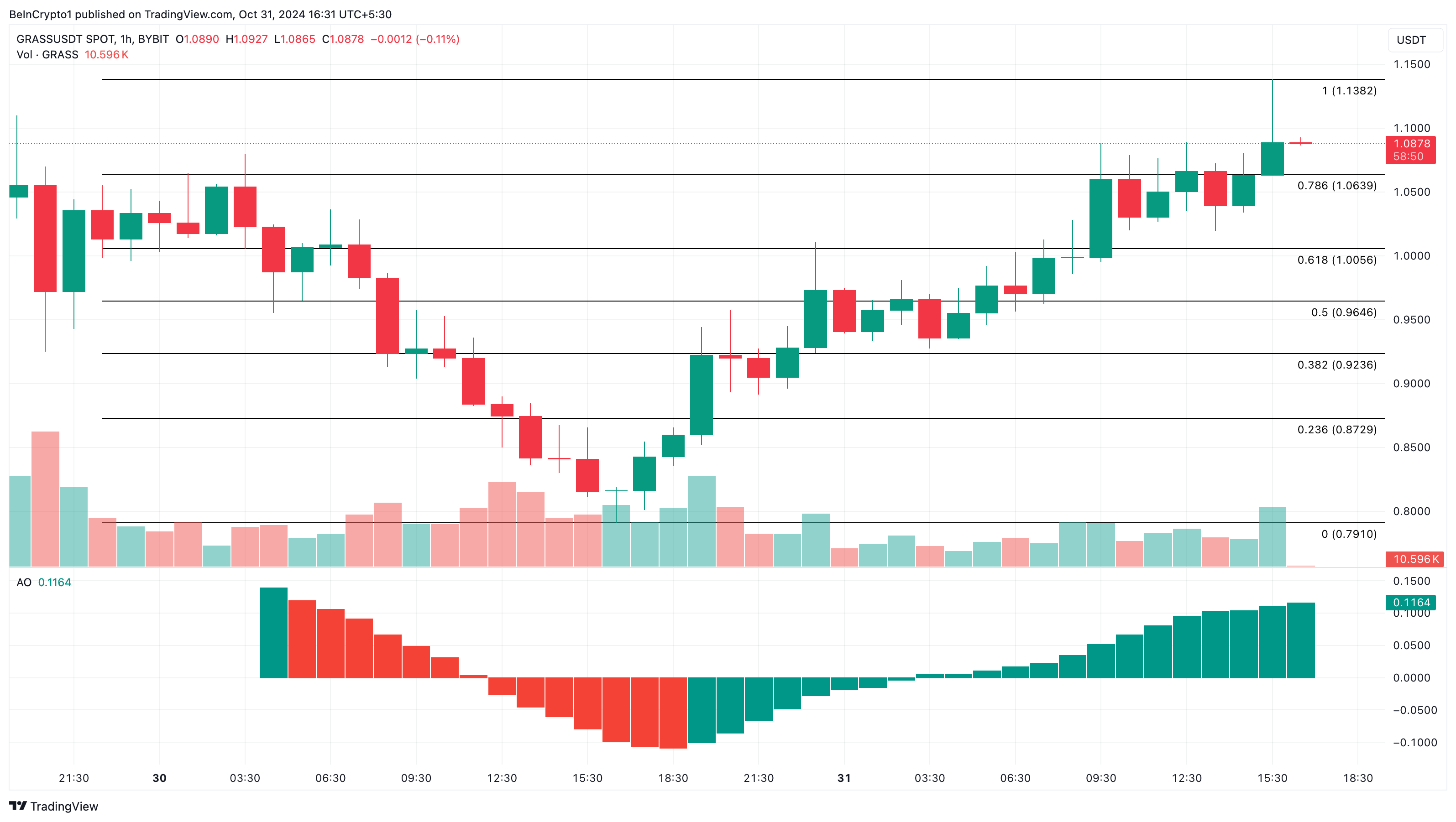 SponsoredNas últimas 24 horas, o preço da GRASS aumentou 34% e agora é negociada a US$ 1,09. No gráfico de 1 hora, o Oscilador Incrível (AO) continua subindo com mais barras de histograma verdes.