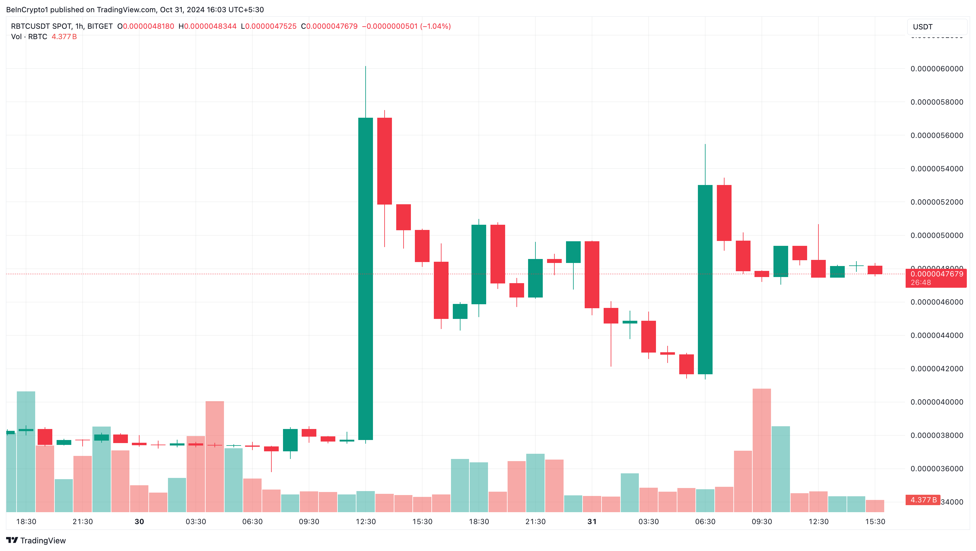 No momento da publicação, o preço da RBTC é de US$ 0,0000048. Embora isso represente um aumento de 27% nos últimos sete dias, também significa uma modesta queda de 1,80% nas últimas 24 horas. No gráfico de 1 hora, a altcoin continua oscilando entre altos e baixos, indicando que ainda não encontrou um equilíbrio.