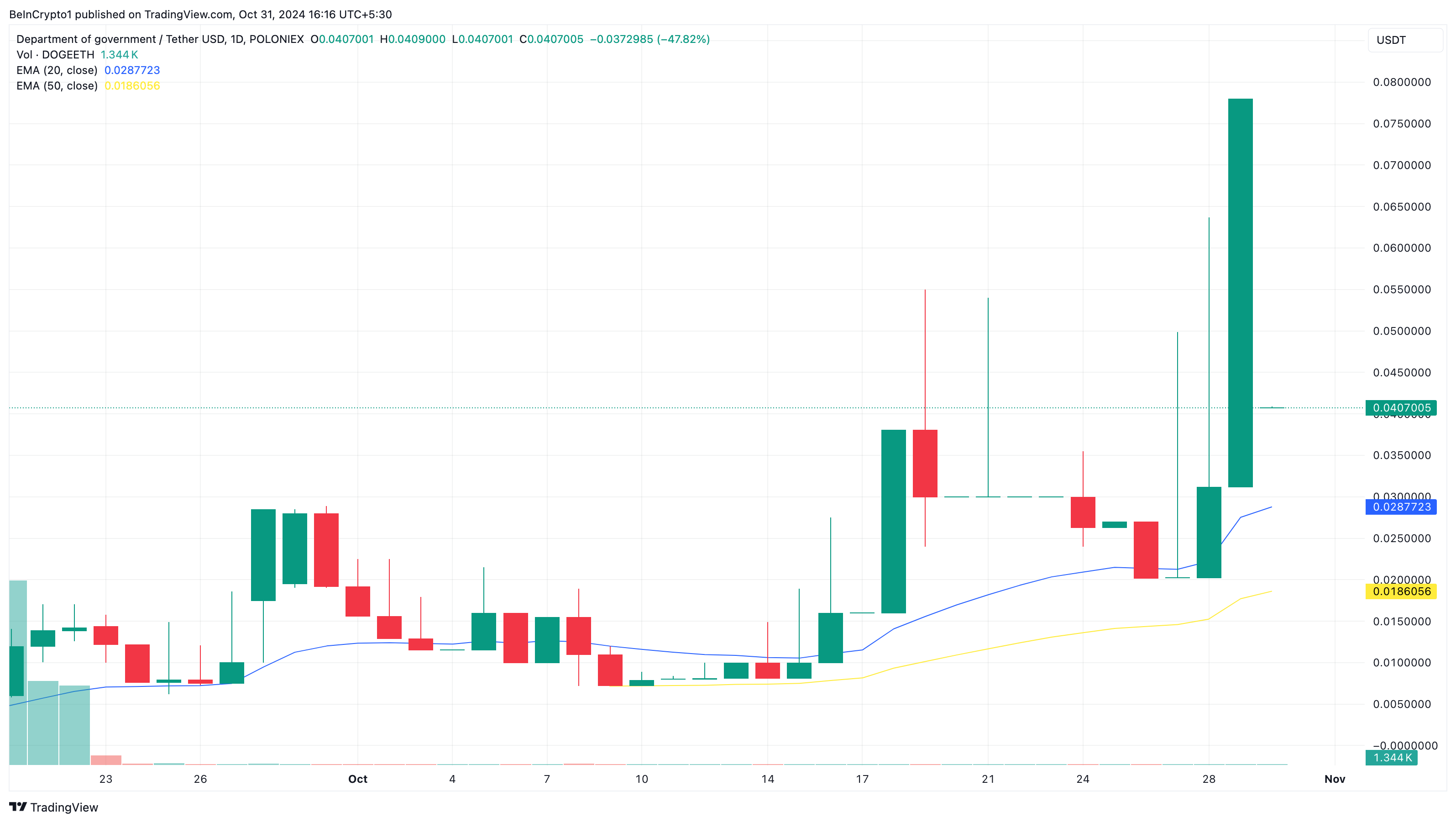 Uma é a crescente probabilidade de Trump se tornar o próximo presidente dos EUA. As outras incluem o pedido repetido de Elon Musk pelo departamento e seu incrível aumento de 67% nas últimas 24 horas. No gráfico diário, o preço da DOGEETH é de US$ 0,41, embora tenha anteriormente atingido US$ 0,078.