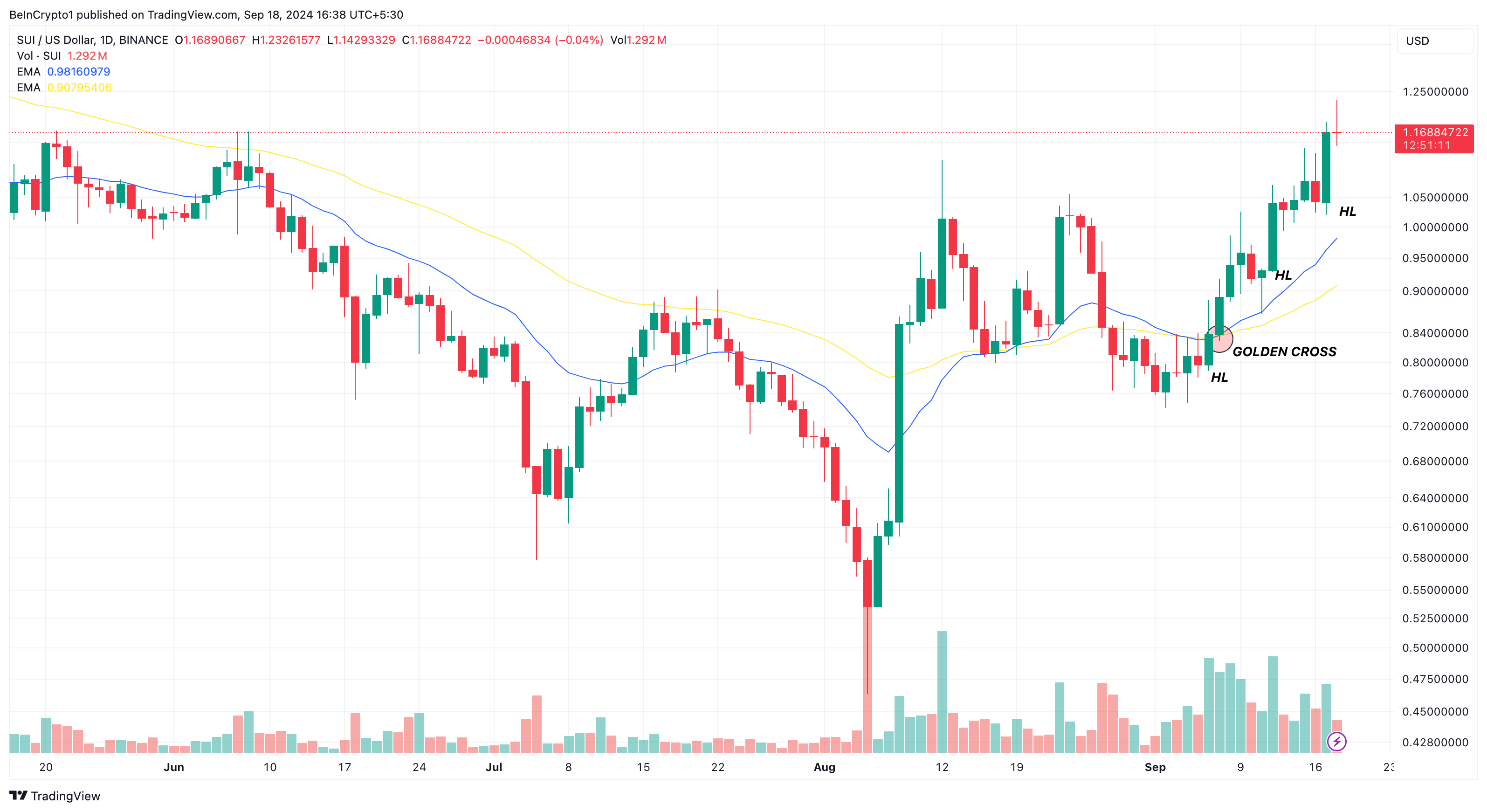 No momento, o token nativo da blockchain layer-1 é negociado a US$ 1,17. De acordo com o gráfico diário, os touros têm ajudado o token a atingir uma sequência de baixas mais altas (HL). Além disso, o Cruzamento de Ouro validou ainda mais a alta.