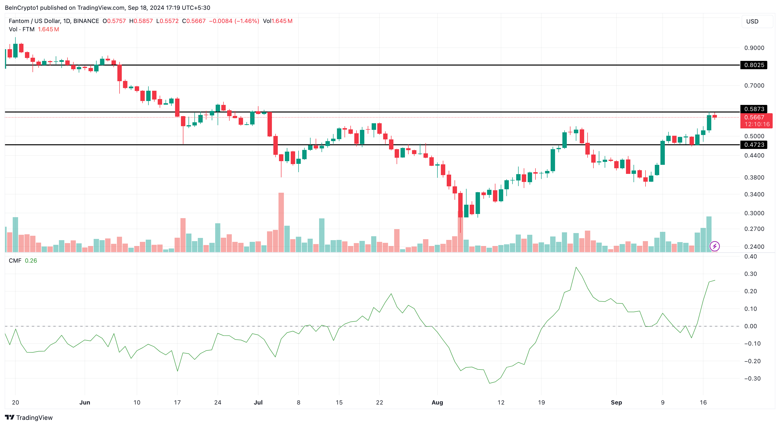 No momento da publicação, o preço do FTM é de US$ 0,57. No entanto, com base no indicador Chaikin Money Flow (CMF) no gráfico diário, o token pode subir ainda mais. O CMF indica se a acumulação está superando a distribuição ou vice-versa.