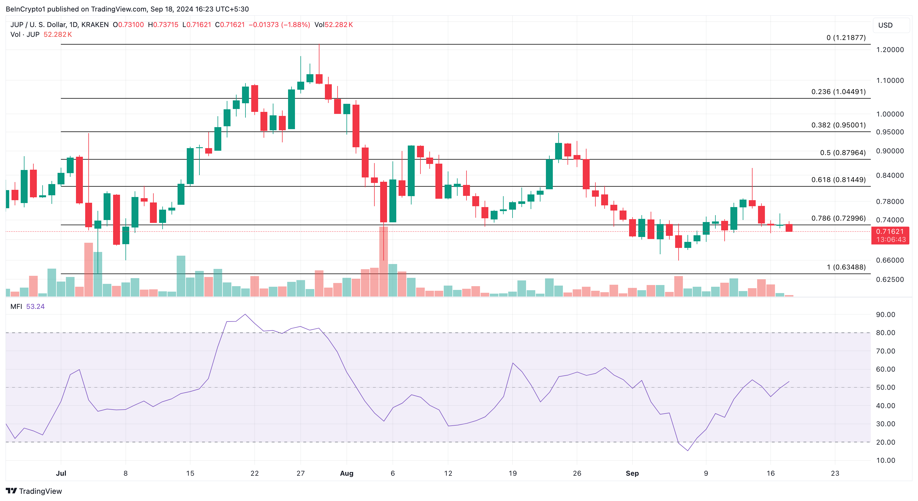 Curiosamente, o Índice de Fluxo de Dinheiro (MFI) subiu acima do ponto neutro de 50,00. Esse aumento indica que os participantes do mercado estão alocando mais liquidez ao token e comprando na baixa. Se isso continuar, o JUP poderia evitar cair abaixo de US$ 0,70.