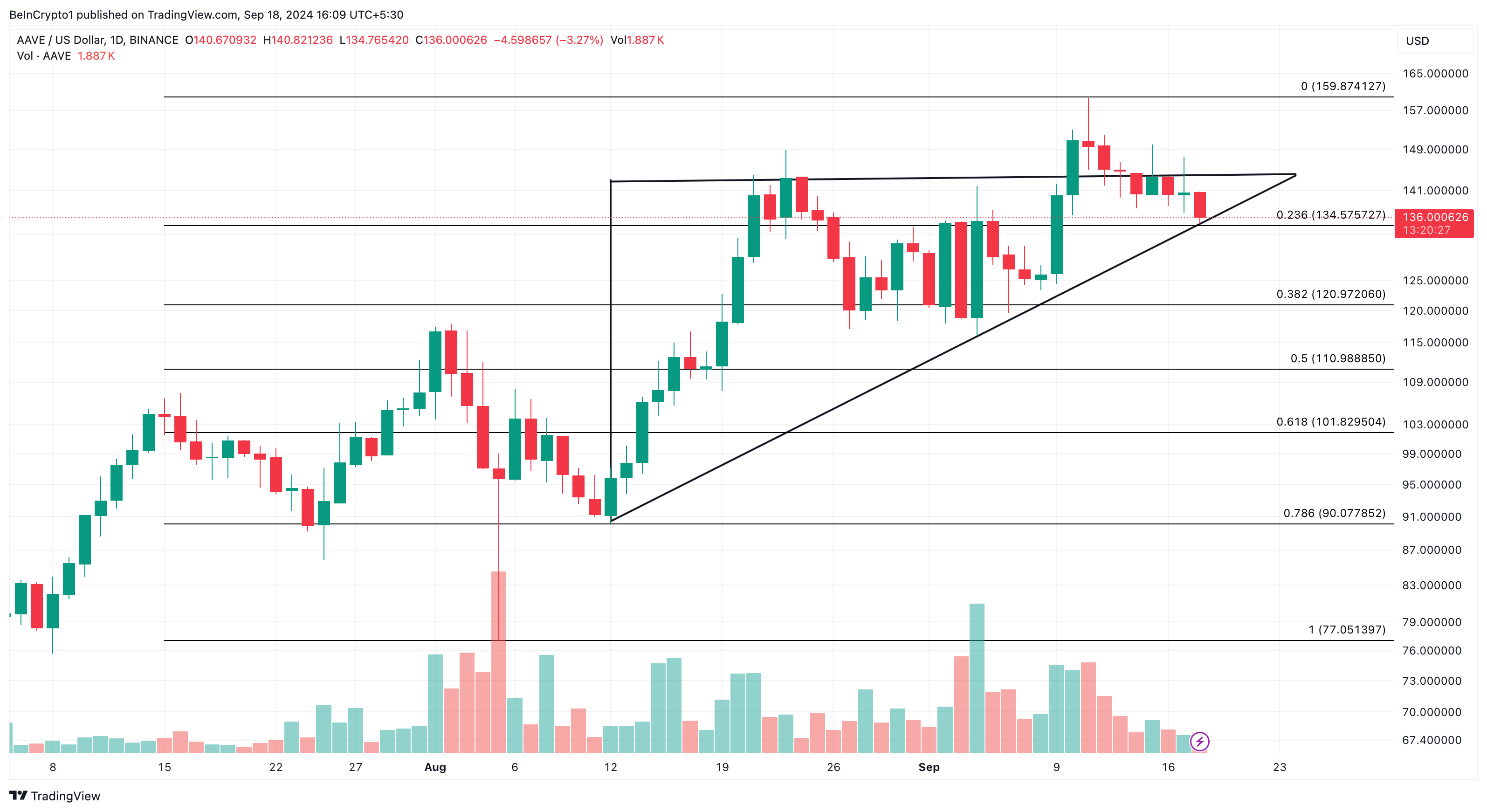 SponsoredNo gráfico diário, o token formou um triângulo ascendente, que é um padrão gráfico otimista. Atualmente, o preço do AAVE é de US$ 136.