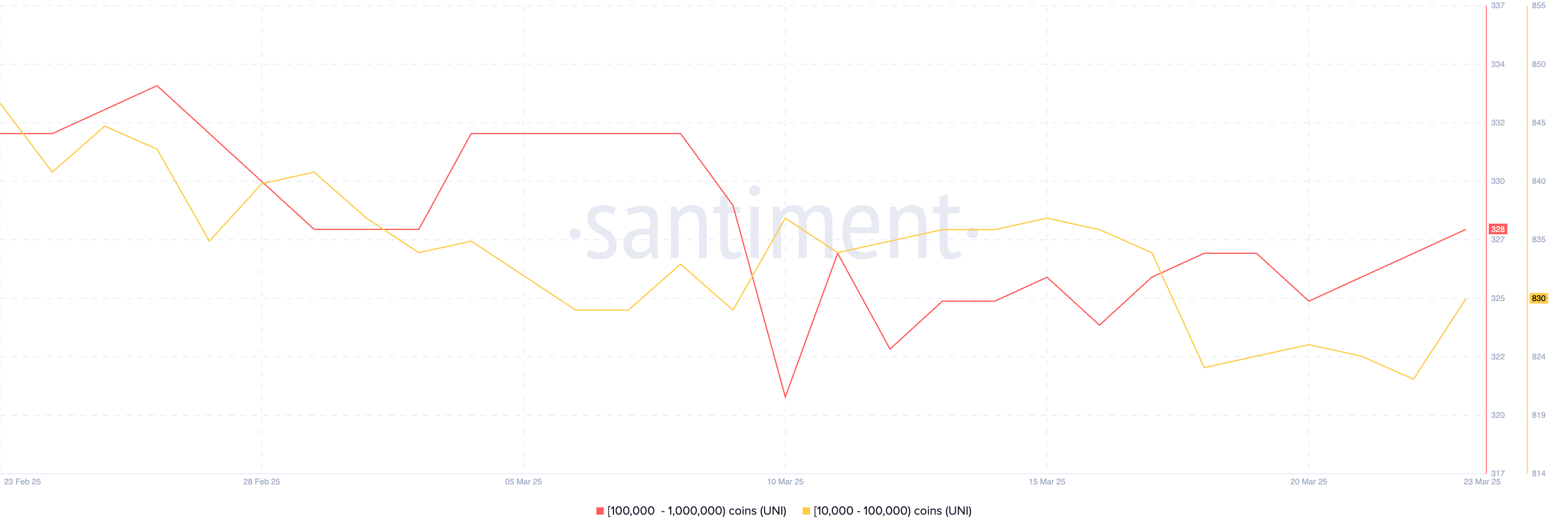 SponsoredNos últimos dias, baleias do mercado de cripto têm acumulado UNI. Entre 20 e 23 de março, o número de carteiras com saldo entre 10 mil e 1 milhão de UNI subiu de 1.151 para 1.158, sinalizando renovado interesse por parte de grandes investidores.