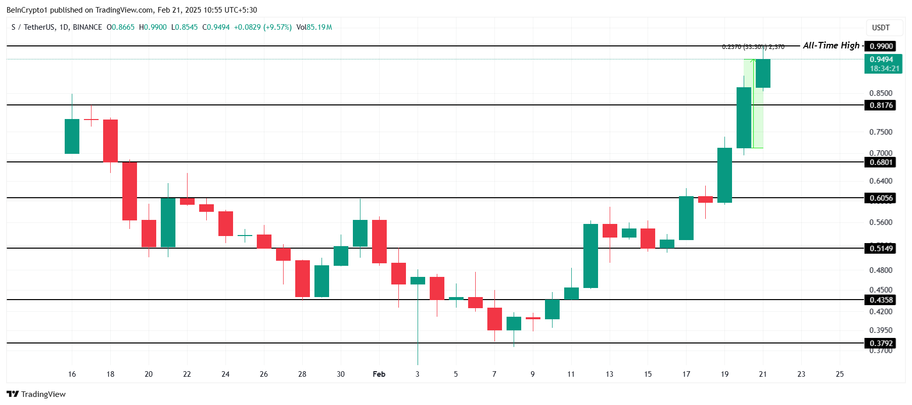 O preço da Sonic subiu 33% nas últimas 24 horas, atingindo um novo recorde histórico de US$ 0,99 antes de cair ligeiramente para US$ 0,94. O desempenho recente da altcoin reflete uma tendência de alta que pode continuar se os níveis de suporte chave se mantiverem e o impulso for mantido no mercado de cripto mais amplo.