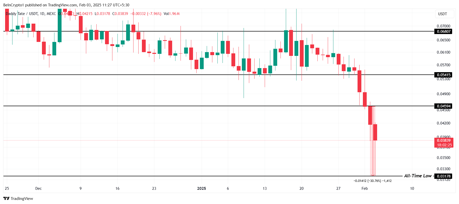 A DADDY experimentou uma queda de 30% durante a mínima intraday de hoje, formando uma nova mínima histórica em US$ 0,0317. Inicialmente ganhando tração como uma memecoin apoiada por Andrew Tate, o preço desde então enfrentou perdas significativas. Este declínio acentuado sinaliza uma incerteza crescente em torno do desempenho futuro do token.