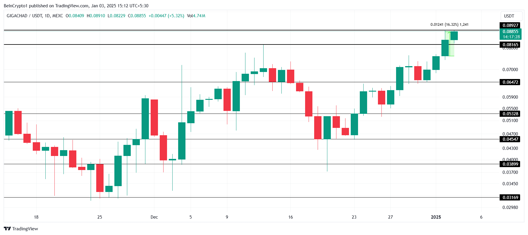 A GIGA subiu 16% nas últimas 24 horas, atingindo um novo recorde histórico de US$ 0,089. Este é o segundo ATH para a memecoin nesta semana, mostrando seu impressionante impulso e capturando forte atenção dos investidores.