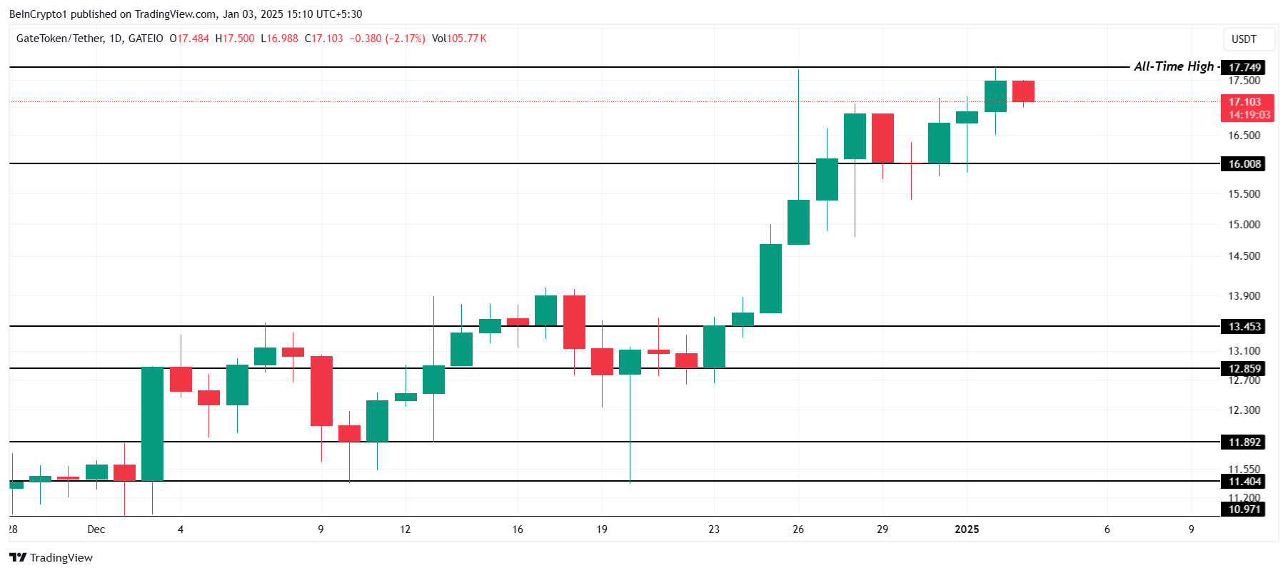 Outro token de cripto que atingiu um novo recorde histórico (ATH) foi GT, que alcançou US$ 17,74 após se recuperar do suporte de US$ 16,00 no início desta semana. Este aumento destaca o forte impulso ascendente da altcoin, capturando a atenção dos investidores e posicionando-a como uma destacada no mercado.