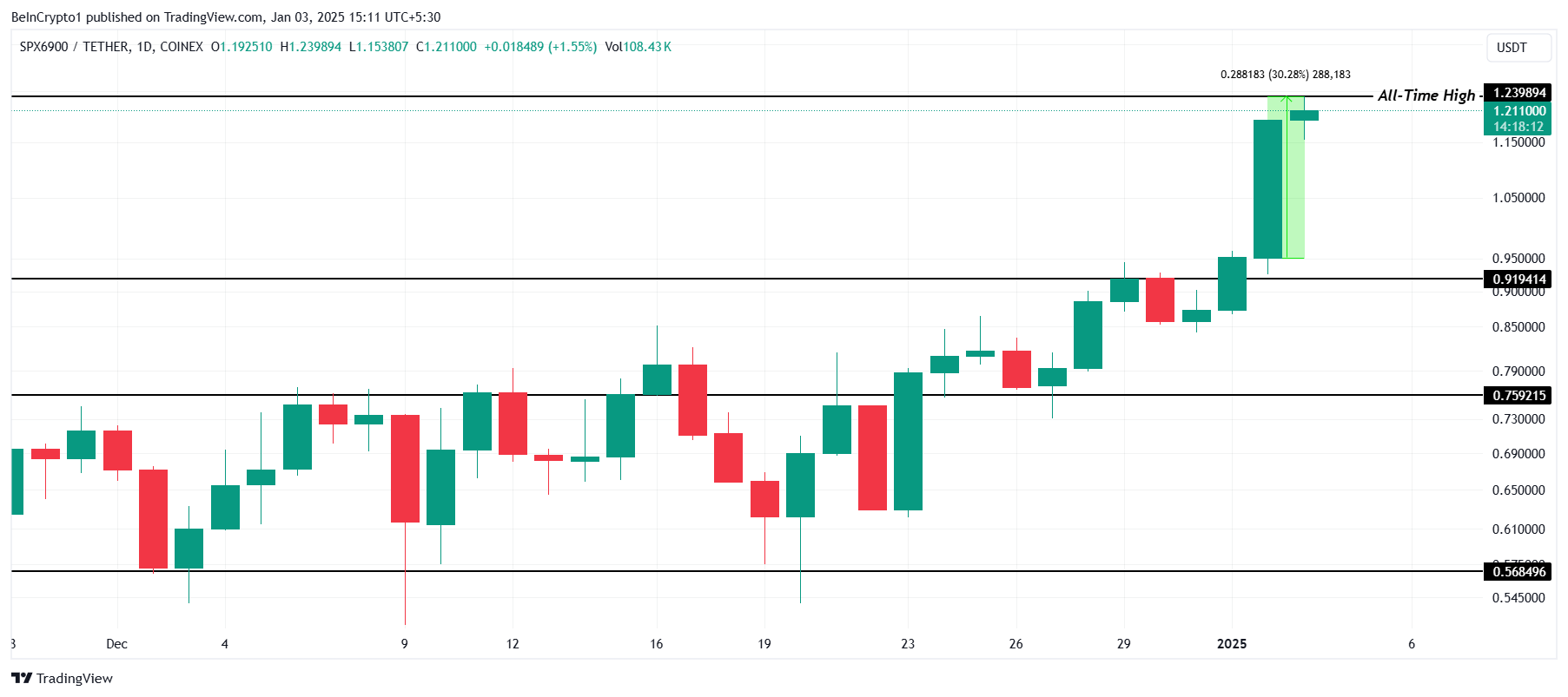 A SPX atingiu um novo recorde histórico de US$ 1,23 após um rali de 30% nas últimas 24 horas. Atualmente negociada a US$ 1,21, o forte desempenho da altcoin destaca o crescente interesse dos investidores e o potencial para um crescimento adicional no curto prazo.