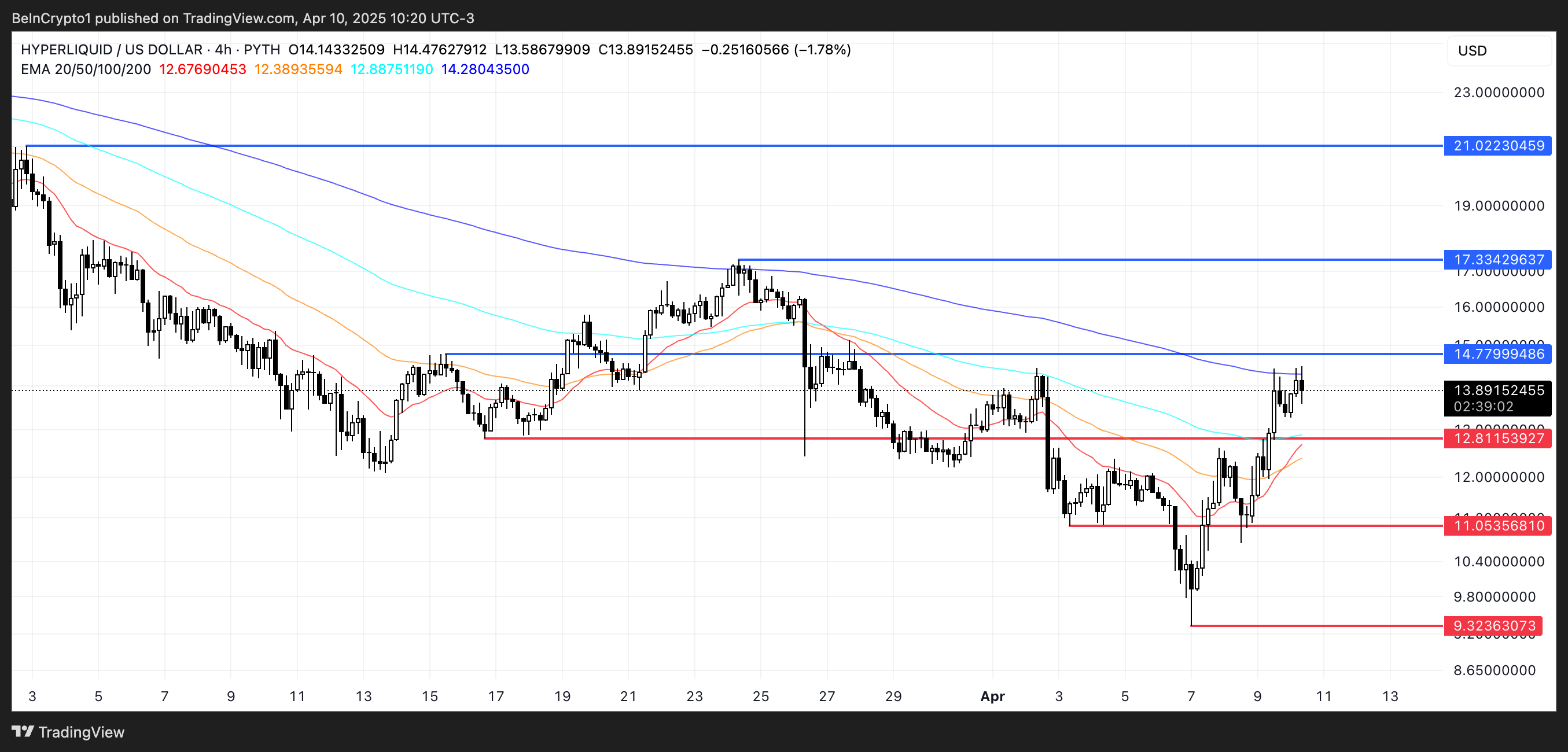 Se o impulso continuar, a HYPE pode avançar em direção à resistência em US$ 14,77, e um rompimento pode levar a US$ 17,33 ou até US$ 21. Mas se o rali estagnar, o suporte em US$ 12,81 torna-se crucial; perdê-lo pode fazer o preço voltar para US$ 11 ou até abaixo de US$ 10 em uma correção mais profunda.