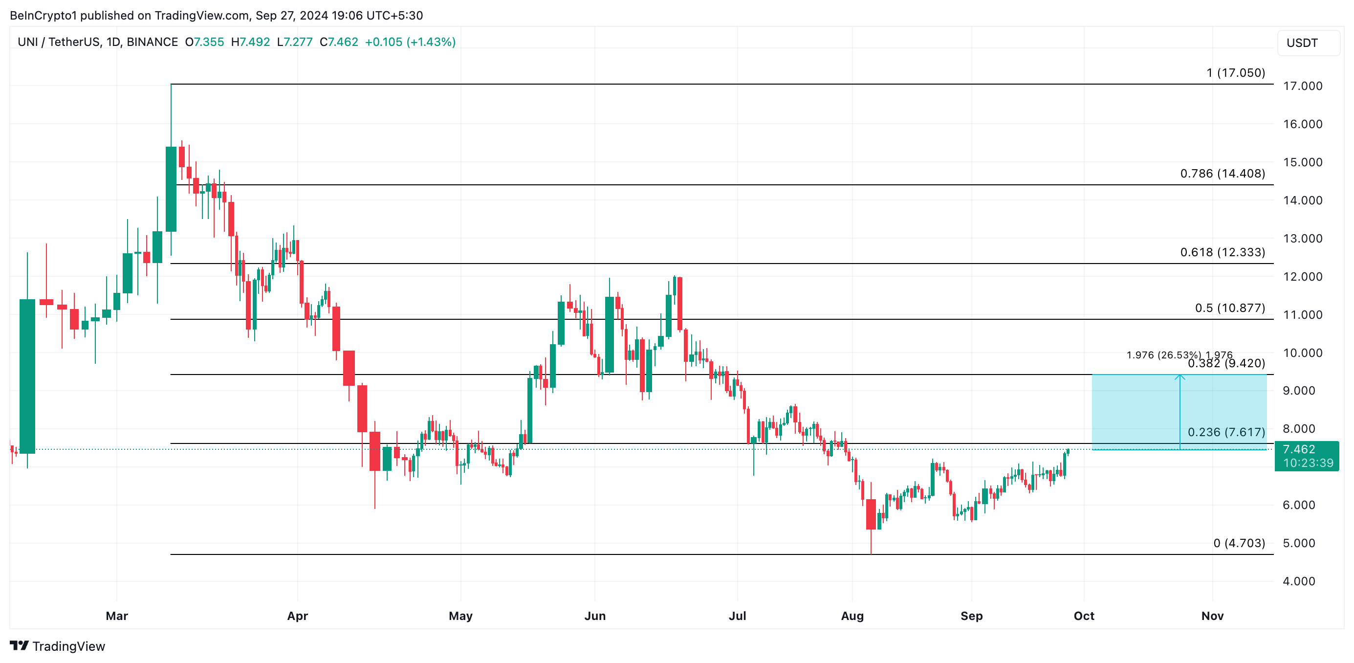 Sponsored SponsoredA expectativa por essa atualização poderá impulsionar o preço do UNI em outubro. No momento, a altcoin é negociada a US$ 7,46, com um aumento de 28% no último mês. Se a tendência ascendente do mercado se manter, UNI poderá tentar ultrapassar o nível de resistência crítico de US$ 9,42.