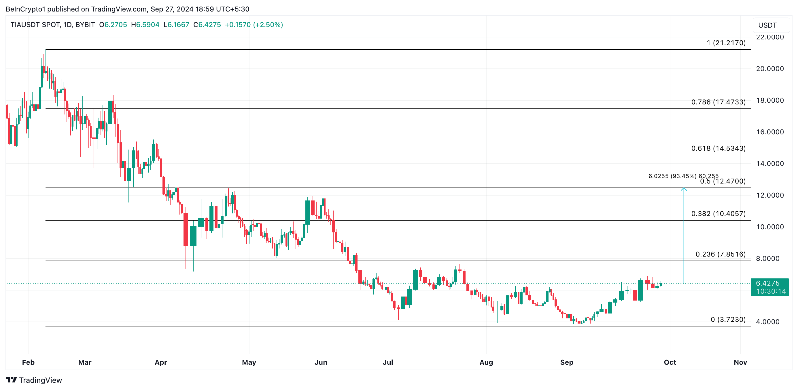 Contudo, se o entusiasmo diminuir à medida que o desbloqueio do token se aproxima, o preço do TIA pode cair para perder seus ganhos e descer para US$ 3,72.