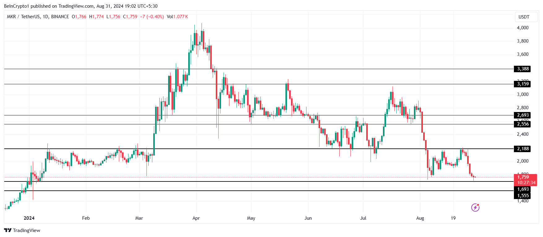 Como resultado, o preço do MKR provavelmente saltará do nível de suporte de US$ 1 693 para subir e testar a resistência de US$ 2 188. A altcoin consolidou-se nessa faixa durante todo o mês de agosto. A potencial alta que surge da transição poderia levar a um aumento para US$ 2 556.