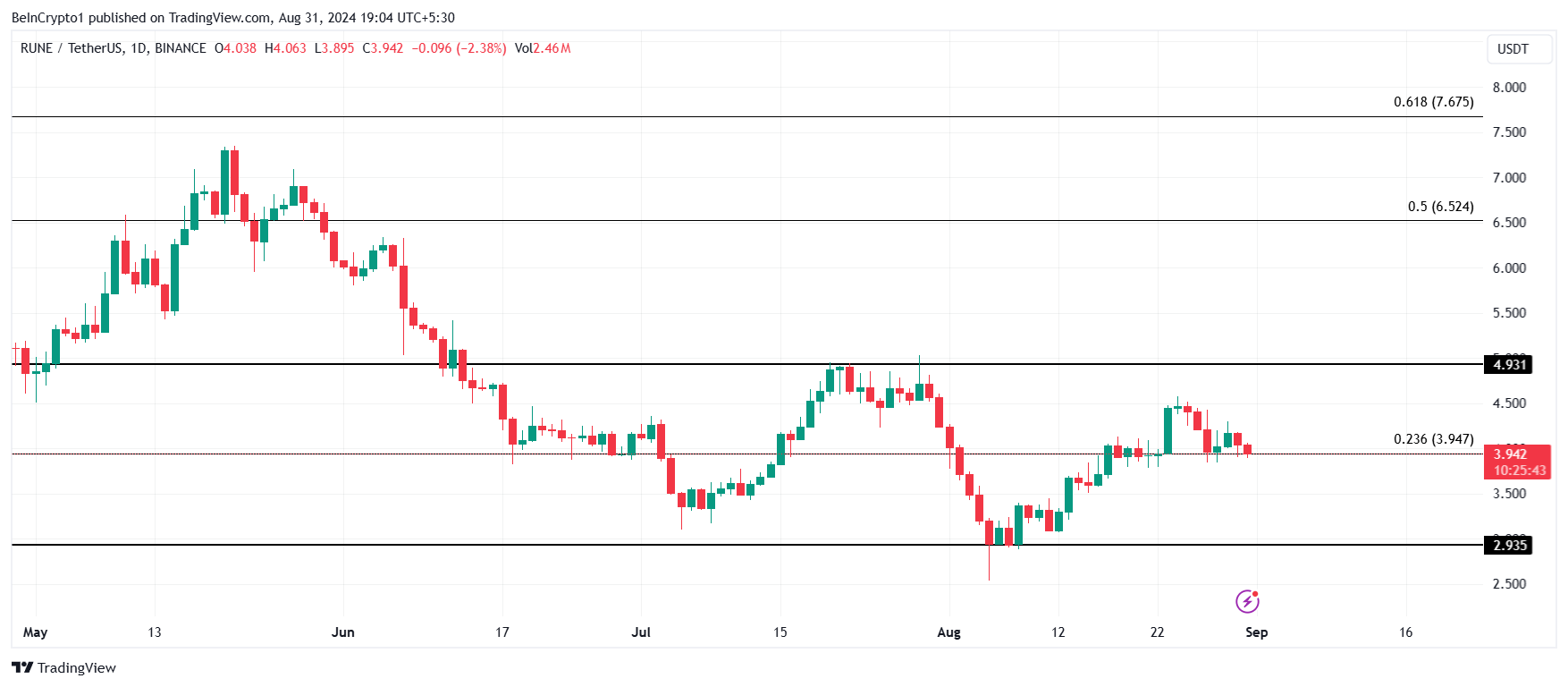 O preço do RUNE recentemente recuperou o piso de suporte do mercado de baixa, ou seja, a linha de Retração Fibonacci de 23,6%. Coincidindo em US$ 3,94, um salto deste nível poderia impulsionar a altcoin além da resistência de vários meses de US$ 4,93.