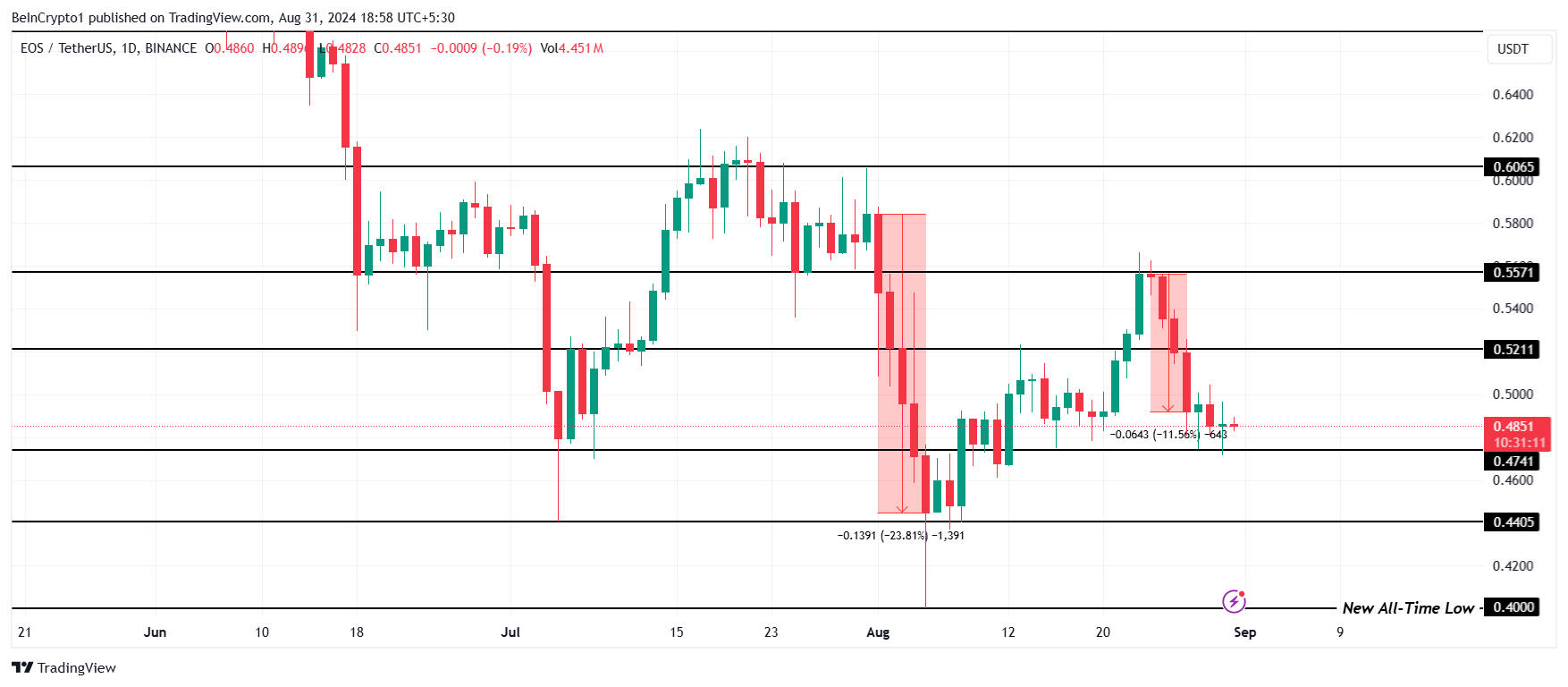SponsoredA queda no preço do EOS quase eliminou a recuperação observada desde o crash de 23% em julho. Para a altcoin recuperar essas perdas, primeiro precisaria transformar US$ 0,557 em suporte, o que não conseguiu fazer recentemente.