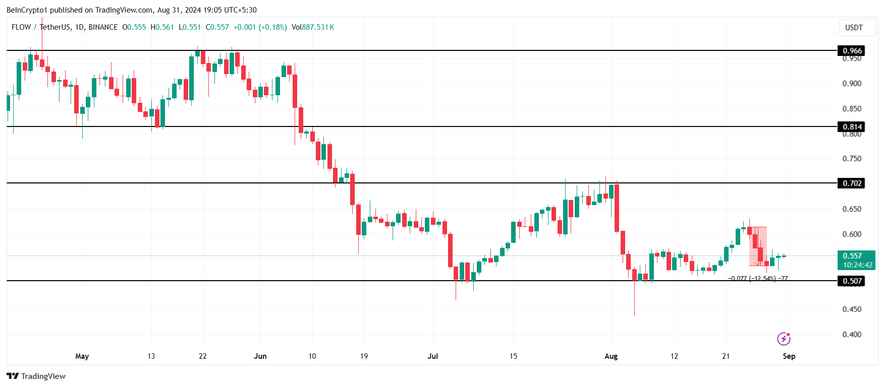 Essa pode ser justamente o estímulo que o Flow precisa para sair de sua consolidação de dois meses e meio. Preso abaixo de US$ 0,70 desde meados de junho, o preço do FLOW precisaria, em suma, de um grande impulso para romper essa barreira e subir além de US$ 0,80.